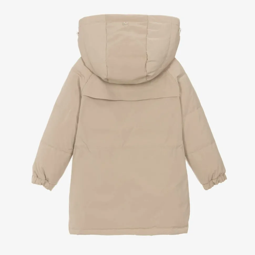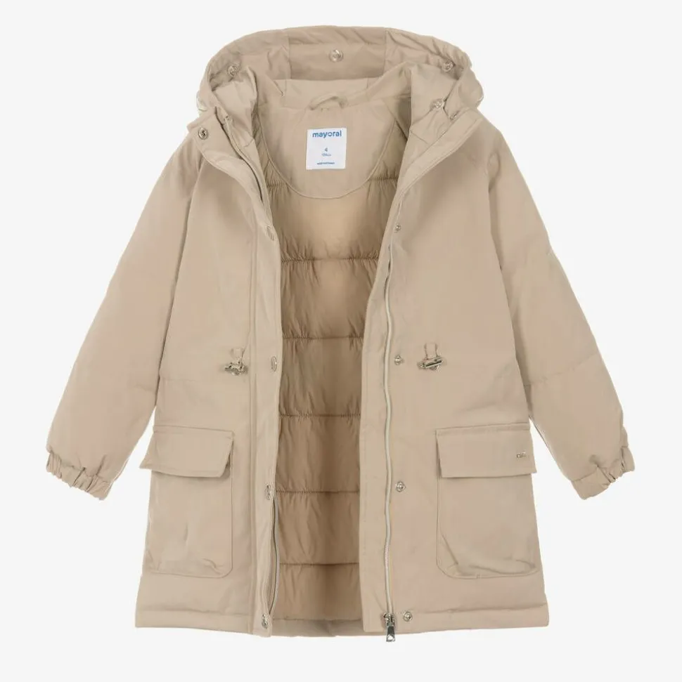 Beige coat for girls by Spanish brand Mayoral, made in smooth fabric with a subtle sheen. Padded for warmth, this practical coat has a silky lining, elasticated cuffs and a fixed hood, with a detachable faux fur trim adding an extra cosy feel. The coat fastens with a zip concealed beneath a silver popper placket, with toggles on the waist to adjust the shape. A metal logo charm can be seen on the flap of one of the front pockets for a discreet designer finish.