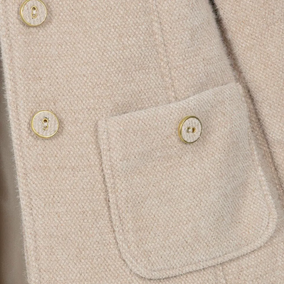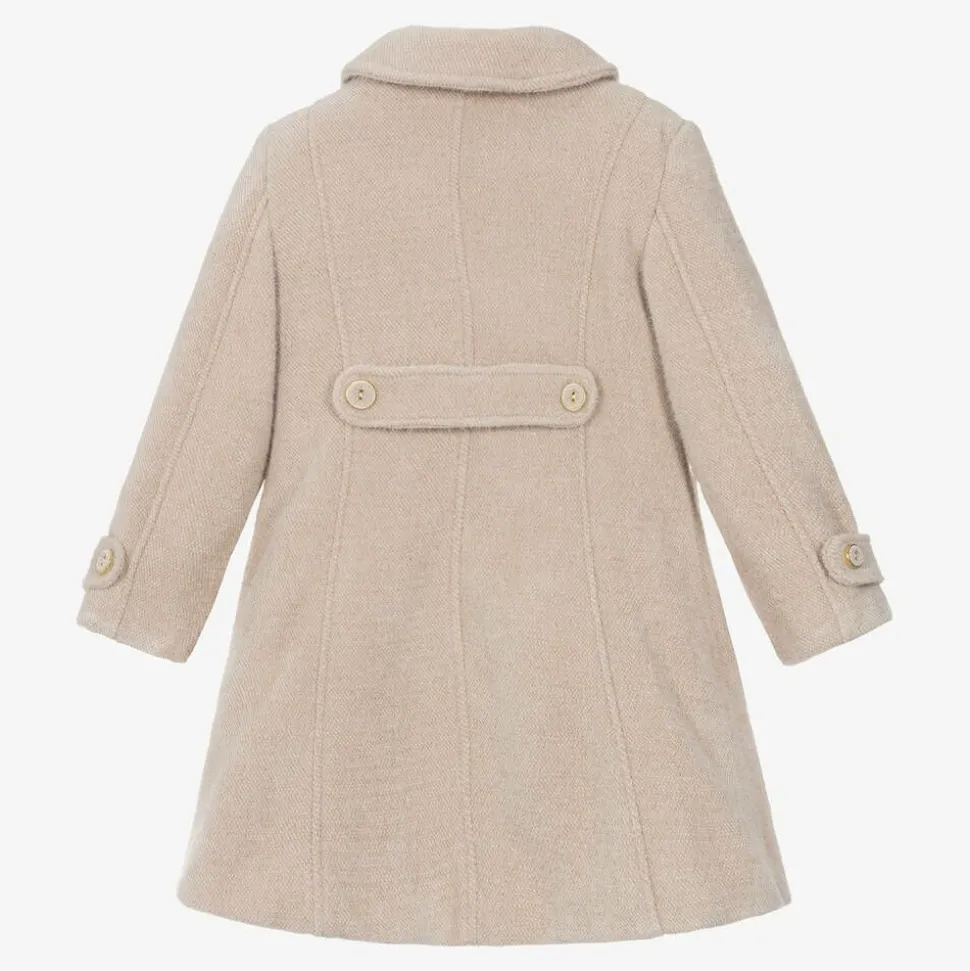 Exclusive to Childrensalon, a traditional beige coat for girls from Portuguese brand, Patachou. Softly woven in metallic rose gold thread, this coat has gold fabric-covered button fastenings on the front, and neat patch pockets. It has a silky smooth lining, and is finished with a decorative strap on the back.