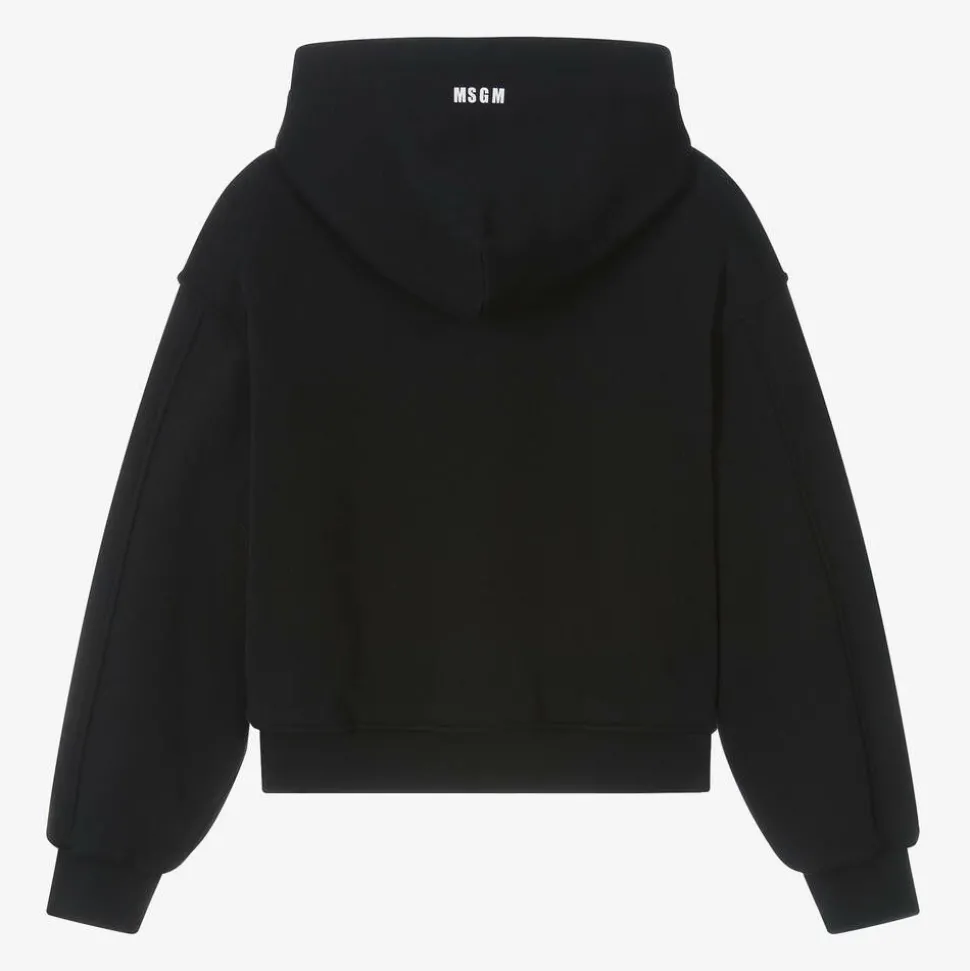A black long-sleeved hoodie for girls by Italian brand MSGM, with a stunning silver heart on the front, sparkling with diamantés, sequins and beads, adding a stylish touch to a casual design. Made in comfortable cotton jersey with a soft fleecy feel inside, it has cosy, ribbed trims and side vents. For a signature finish, there is a white logo print on the hood.