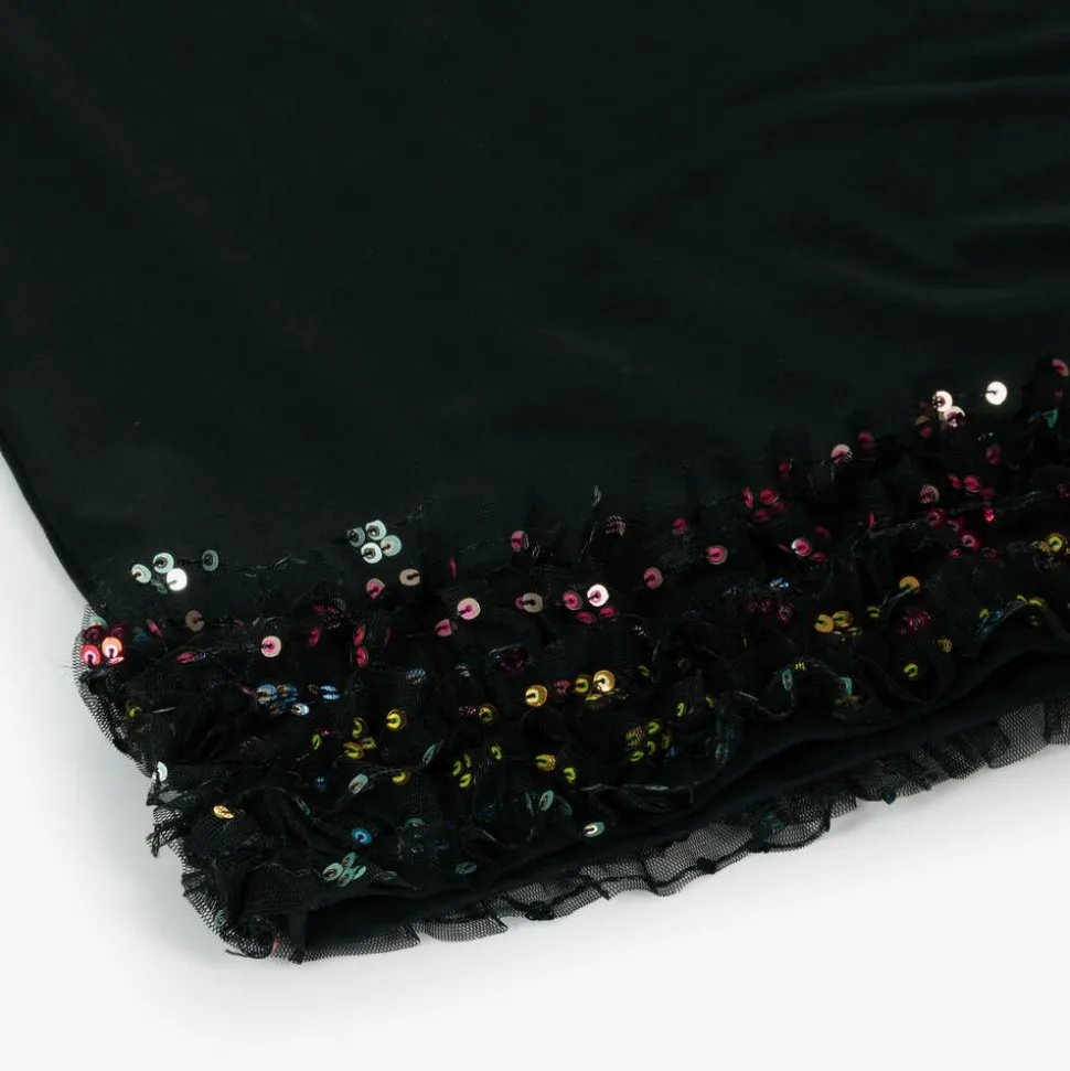 Black dress for girls by AIGNER, made in soft cotton jersey. In a simple, yet elegant design, this comfortable A-line shaped dress has a stylish handbag and logo motif on the front in glittery gold and pink. The hemline is trimmed with colourful sequinned ruffles that sparkle beautifully in the light.