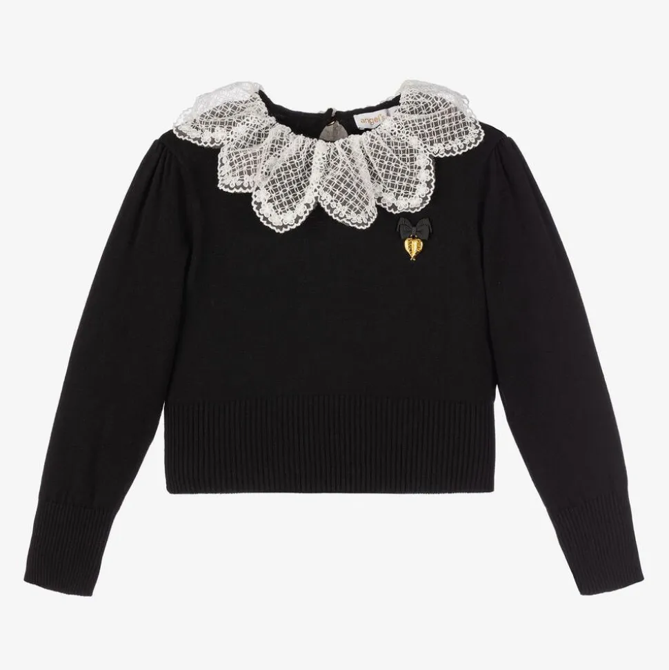 A softly knitted black cotton sweater for girls by Angel's Face. It features a beautiful floral lace white collar and pretty puffed sleeves. Fastening with a single heart button on the back, it has the brand's signature grosgrain bow and golden heart charm on the chest.
