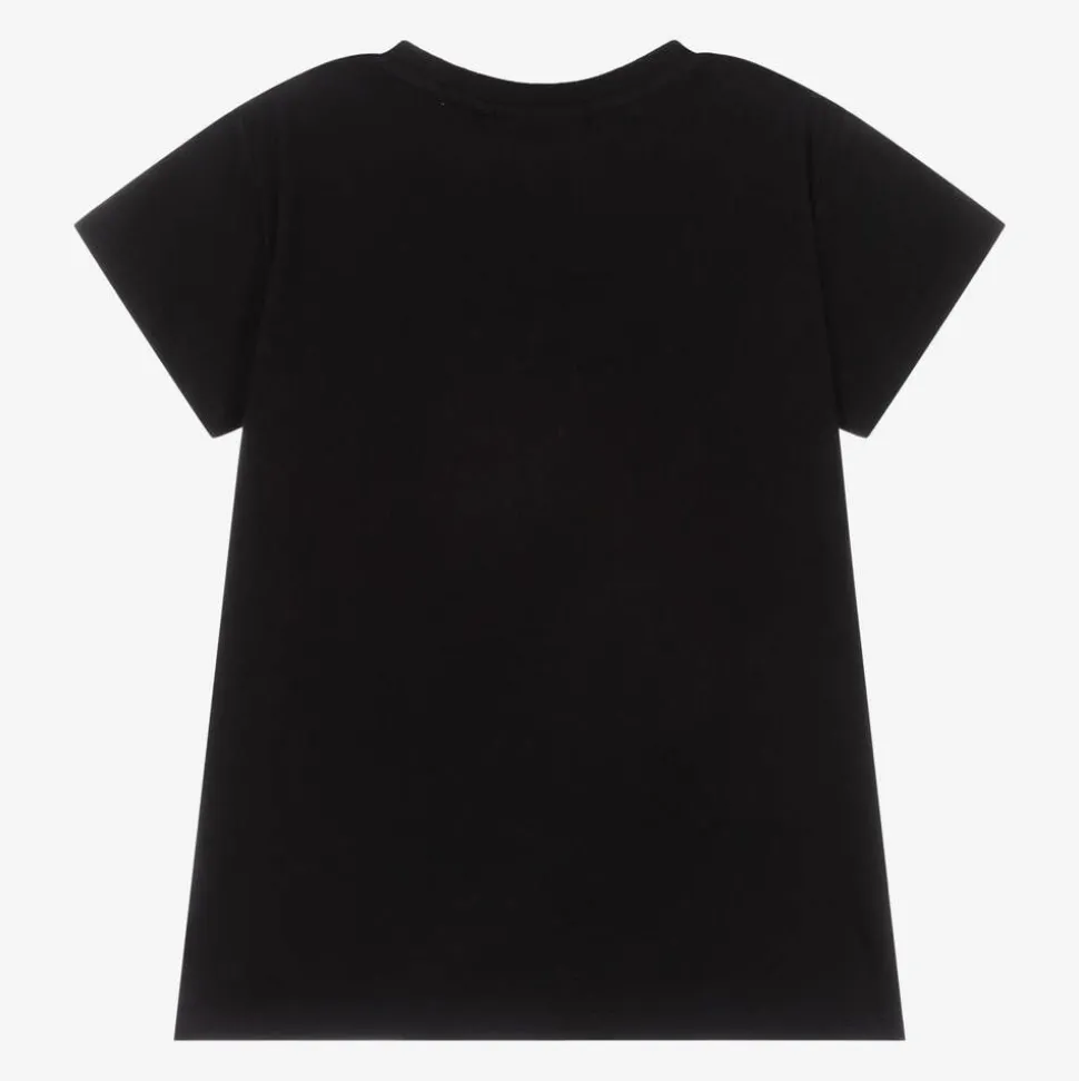 Black organic cotton T-shirt for girls by Danish eco-label Molo, comfortable in soft jersey. Adding shimmer and sparkle, two happy cherries are stitched on the front in orange, pink and blue sequins.
