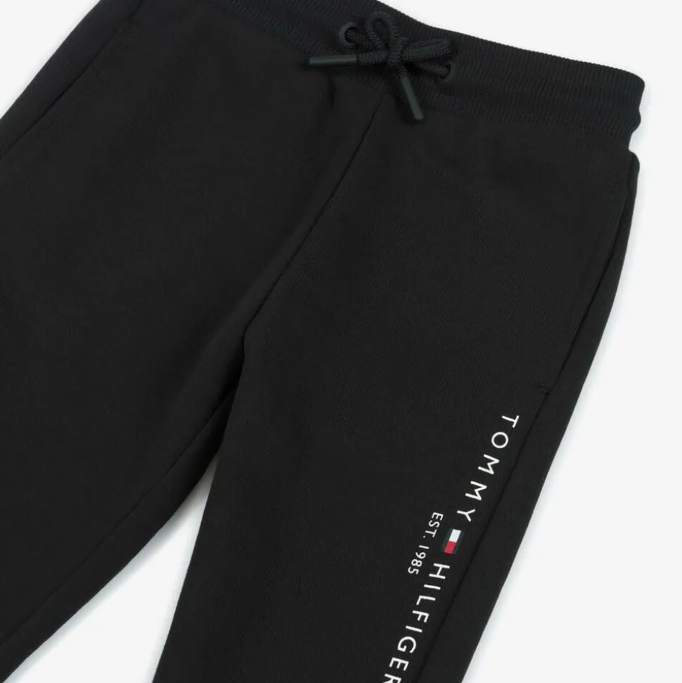 Black tracksuit for girls by Tommy Hilfiger, made in soft cotton blend jersey for comfortable wear. Casually styled with raglan sleeves and stretchy ribbed trims, the sweatshirt has an embroidered white logo on the front for instant designer appeal. The cuffed joggers have a matching logo printed down one leg, useful side seam pockets and a drawstring elasticated waistband for an ideal fit. Both pieces feature a small flag logo for a signature finish. This product is made with at least 20% recycled cotton.