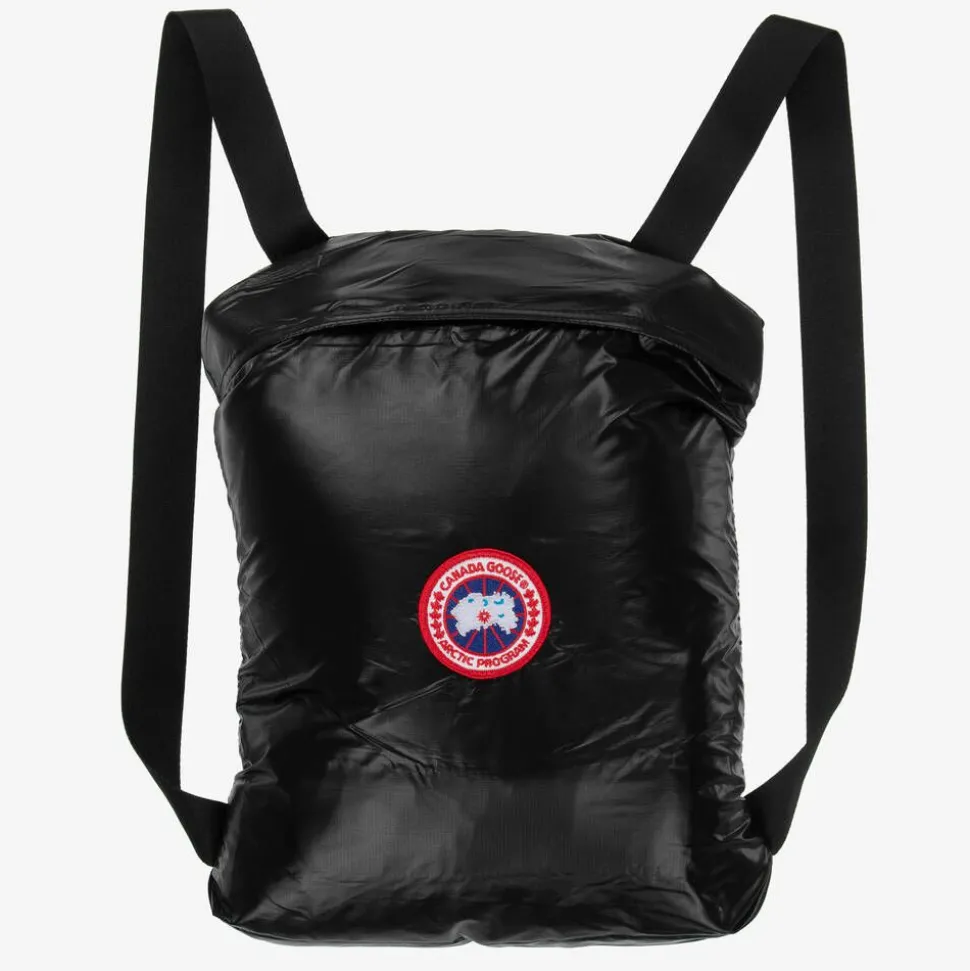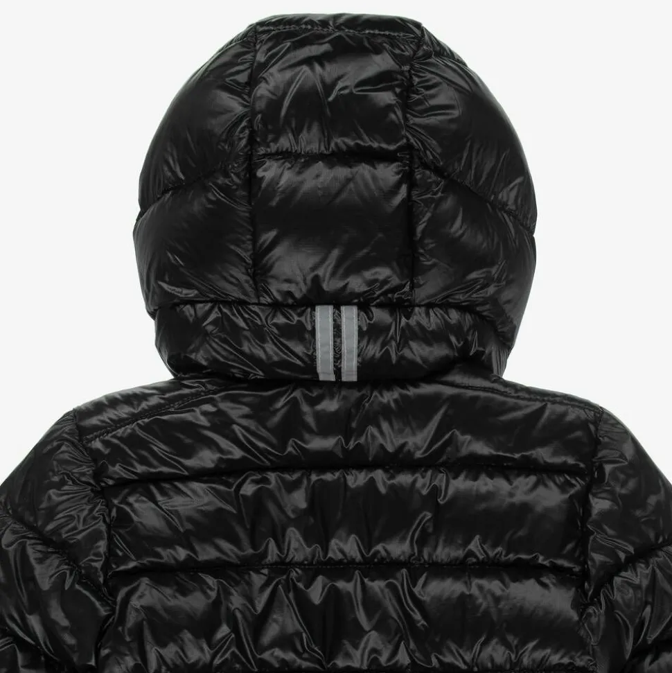 Black Mini-me puffer jacket for girls by luxury brand Canada Goose, with the iconic logo badge on one sleeve. It features reflective trims on the hood, a white logo on the inside of the black zip placket and an elasticated panel on the back for a good fit. There are stretchy, recessed cuffs on the sleeves to keep the elements out and concealed zip pockets on the front. Luxuriously down padded, it is made from ultra-lightweight, recycled nylon ripstop with a water-repellent finish. Designed for light rain, snow and wind, this versatile jacket folds away into the interior pocket to be carried hands-free as a backpack.