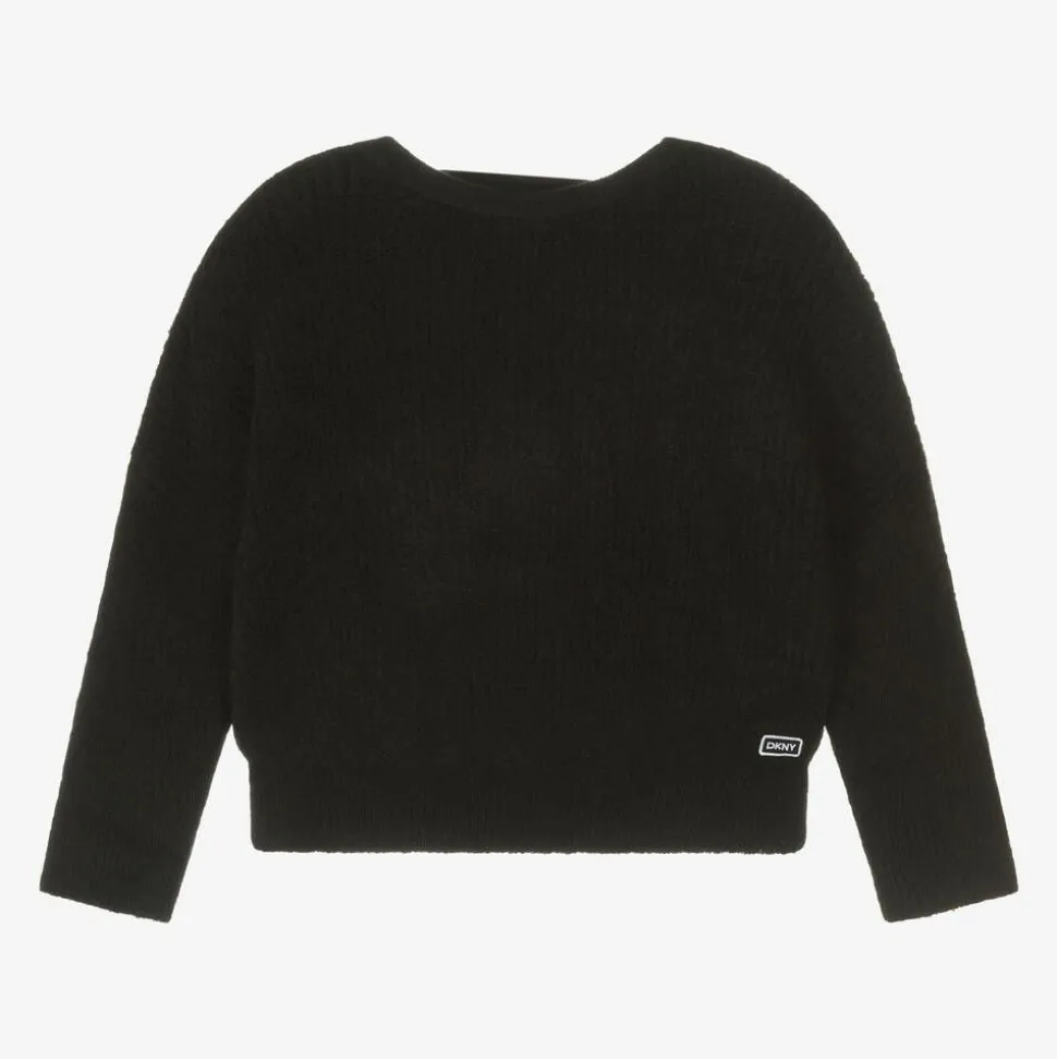 Beautifully soft, fluffy knit black jumper for girls by DKNY, with a touch of wool for cosy warmth. Styled to sit on the waist, it has a cool dropped shoulder fit, gently ribbed trims and an embroidered logo above the front hem. It has a scooped back and an elasticated strap with a bold white logo print for added designer style.