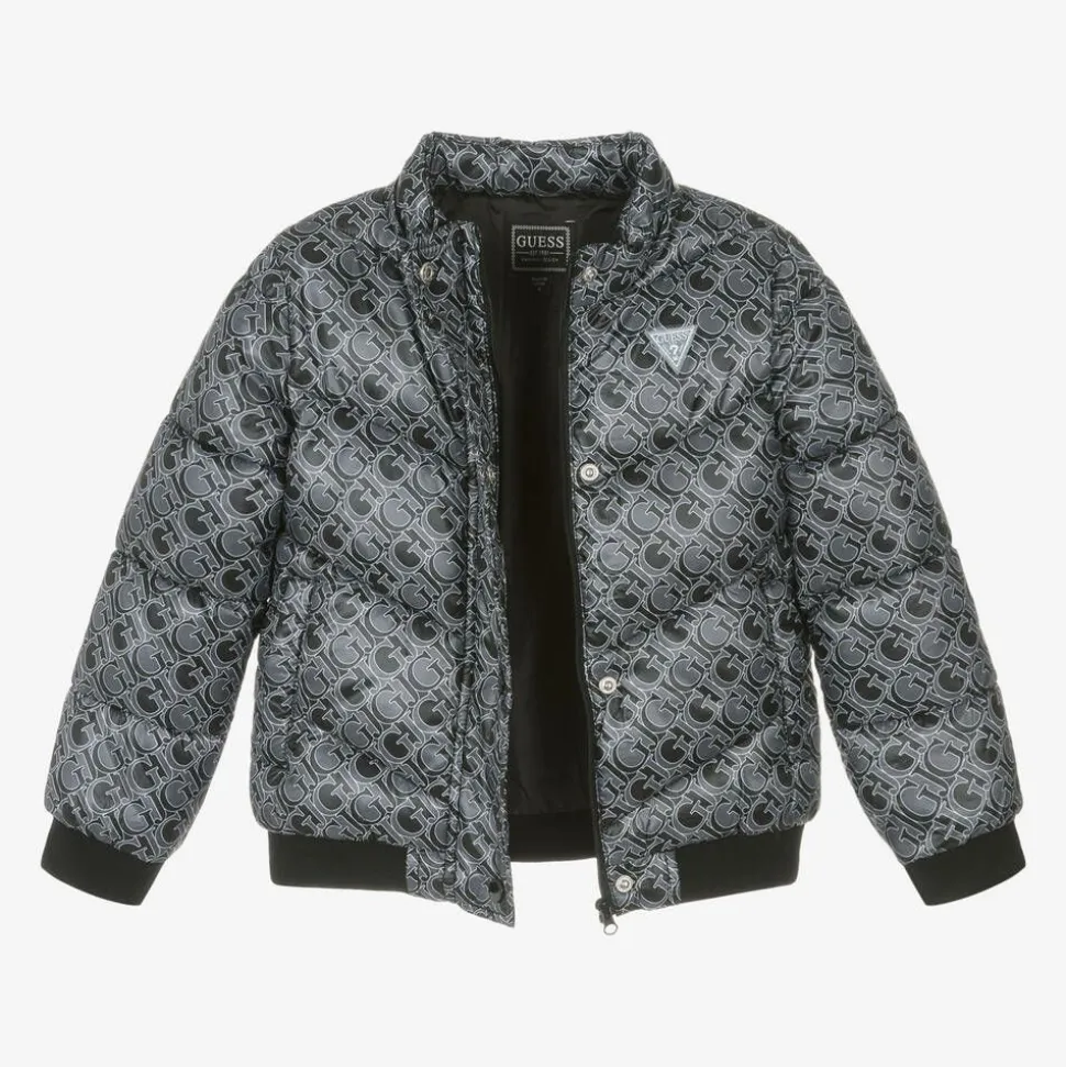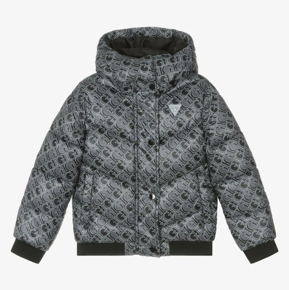 Stylish black bomber-style puffer jacket for younger girls by Guess, patterned with grey monogram logos. Silky smooth with a mid-weight padding for warmth, it has black ribbed trims, two pockets on the front and a rubberised triangle logo patch on the chest. For extra protection against the elements, it features a detachable zip-on hood that secures with velcro on the neck and a popper-fastening storm placket with a full zip underneath.