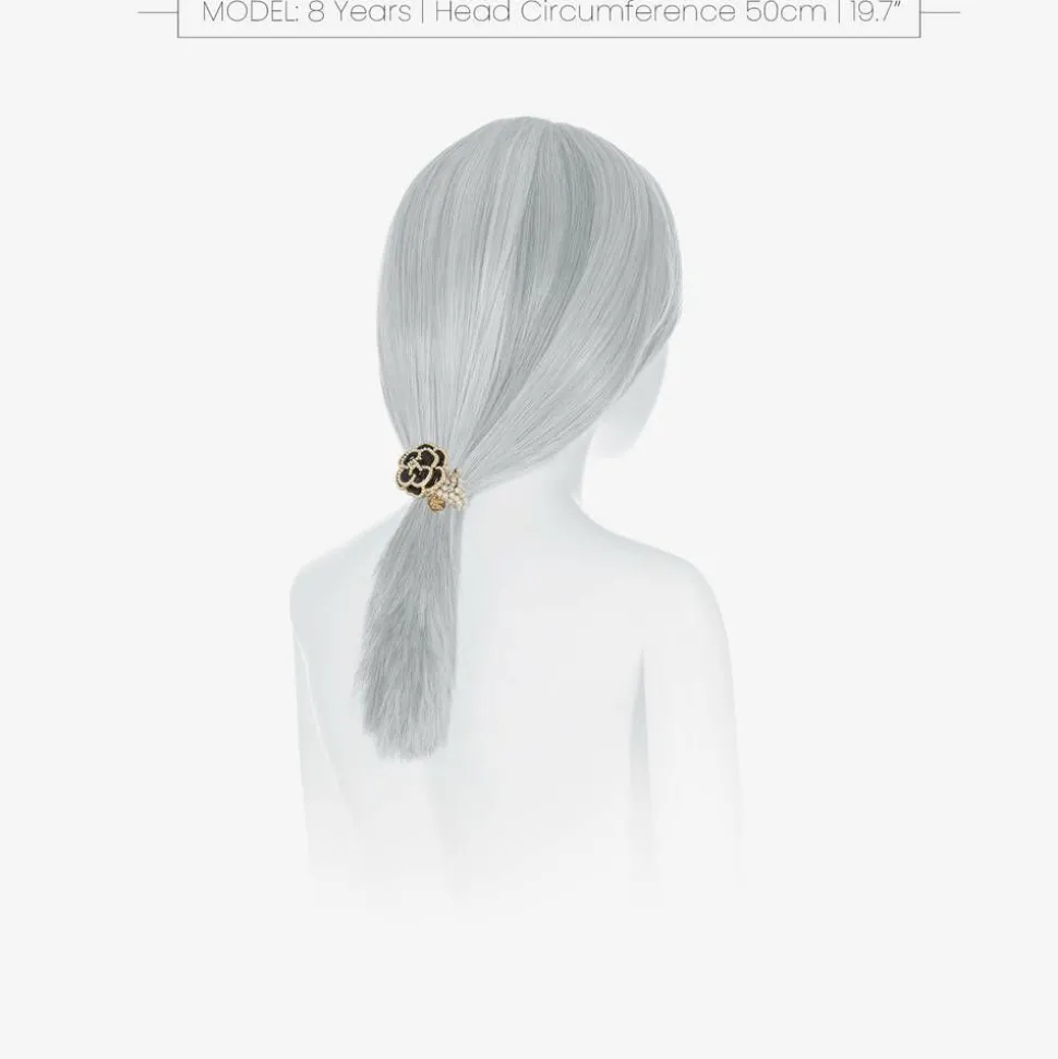 Black hair elastic for girls from David Charles. A lovely addition to an outfit, it is covered with faux pearl beads and finished with a flower centrepiece.
