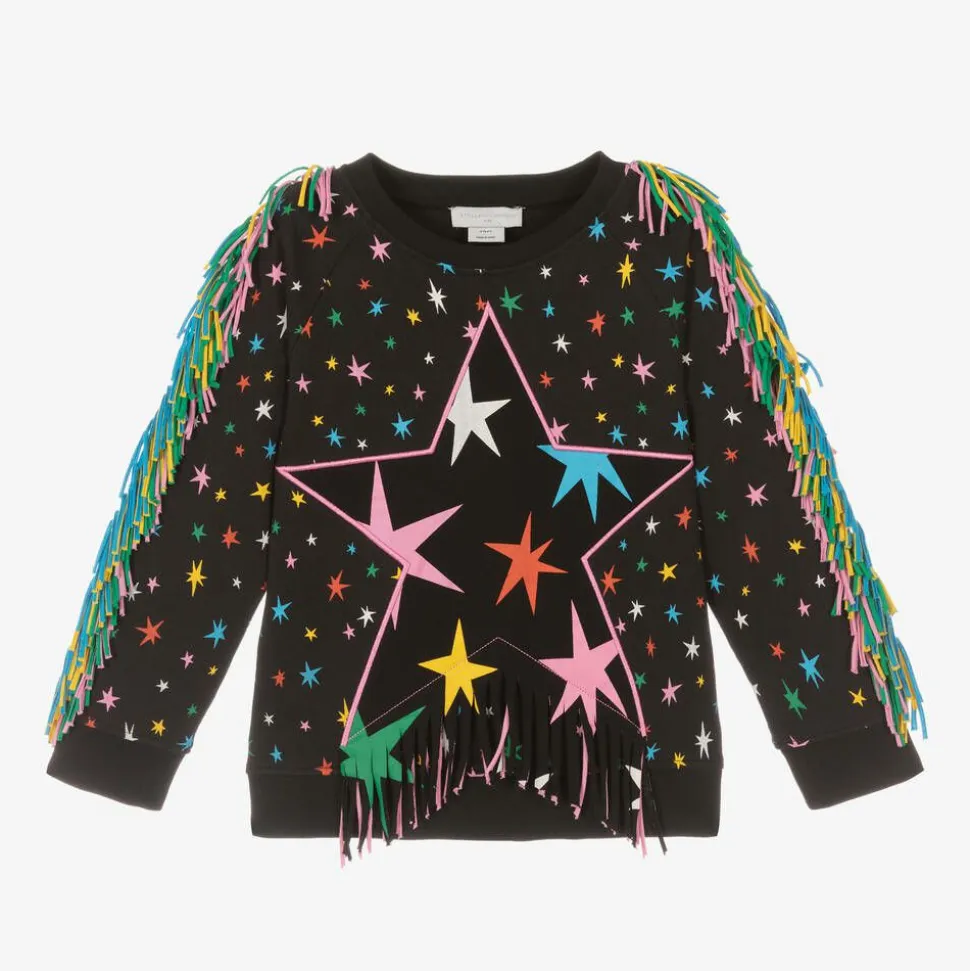 A cool black sweatshirt for girls by Stella McCartney Kids. Patterned with colourful stars, it has fun fringing details and a large pink star embroidered on the front. This comfortable style is made in mid-weight organic cotton jersey with a cosy fleece feel inside. The Stella McCartney fit can be quite small so choose a size up if you want room to grow.