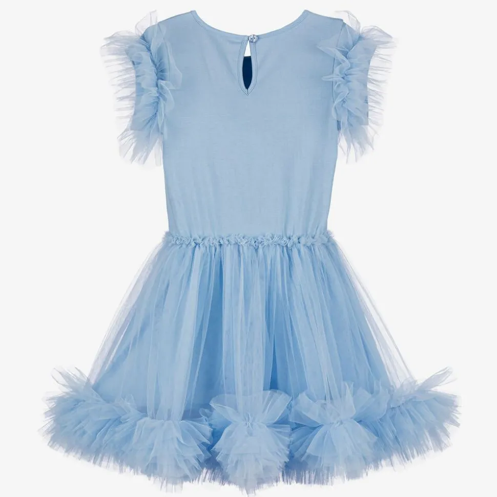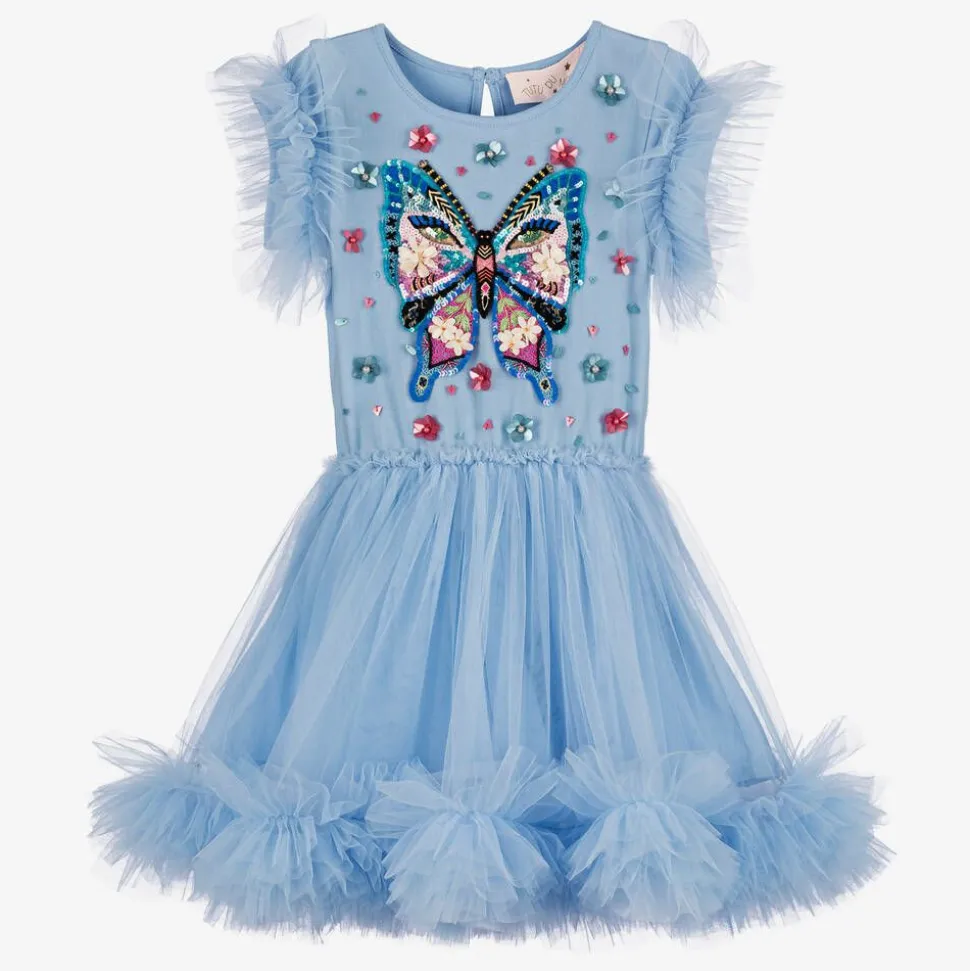 Blue dress for girls by Tutu du Monde, beautifully made in soft tulle. The decorated bodice is designed with a butterfly motif comprised of shimmering sequins, intricate embroidery and colourful beads, with fabric flowers. Tulle ruffles trim the short sleeves, matching the voluminous hem on the skirt. The dress is comfortably lined with soft jersey on the bodice and lightweight voile on the skirt. The keyhole button fastening on the back completes the look. Items are made to last and become more lovely with wear as slight fading and fraying edges adds to their charm.