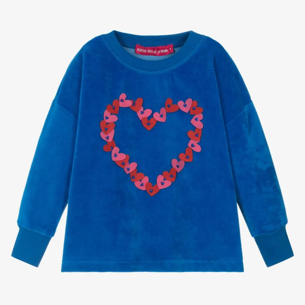 Blue cotton top for girls by Agatha Ruiz de la Prada, with the brand's signature red and pink hearts appliquéd on the front, sparkling with glittery blue centres. Made in comfortable, super soft velour with long sleeves and cosy, ribbed trims, it is just right for brightening up casual days.