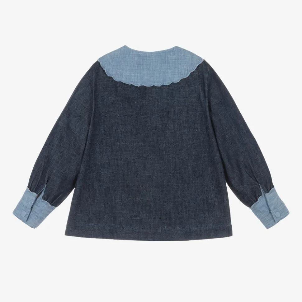 So lovely for girls, this indigo blue denim blouse is by British brand Stella McCartney Kids. Made from soft organic cotton, this loose-fitting top has light blue chambray trims with pretty scalloped edges. The pretty pink and red floral patchworks and green landscape appliqués give it a fun and nostalgic farmhouse-inspired design. It fastens with branded pink poppers on the front. The Stella McCartney fit can be quite small so choose a size up if you want room to grow.