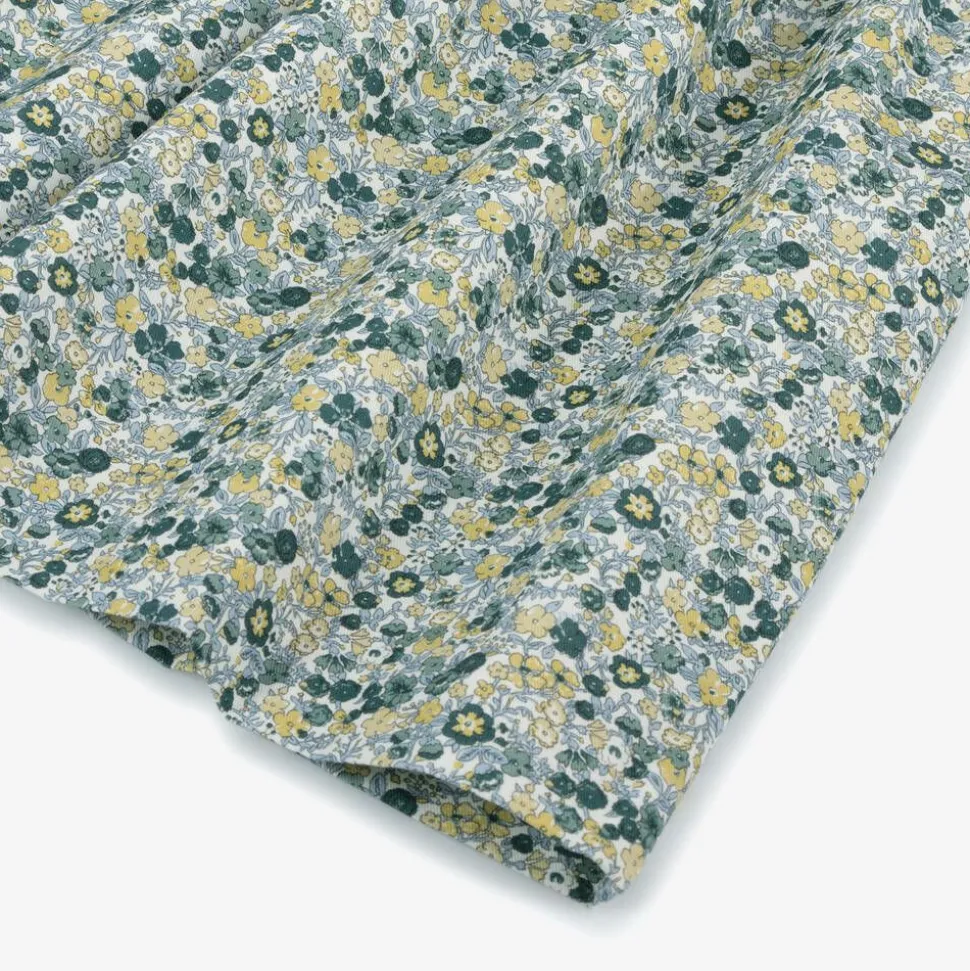 A blue dress for girls by Spanish brand Paloma de la O. It is made in soft cotton twill and patterned in a pretty floral print in shades of blue and pastel chartreuse green. It has a contrasting blue, Oxford cotton collar, trimmed in delicate lace and decorated with beautiful floral embroidery. Lined in lightweight voile for comfort, this traditional style has frilly cuffs on the long sleeves and fastens with tonal buttons on the front.