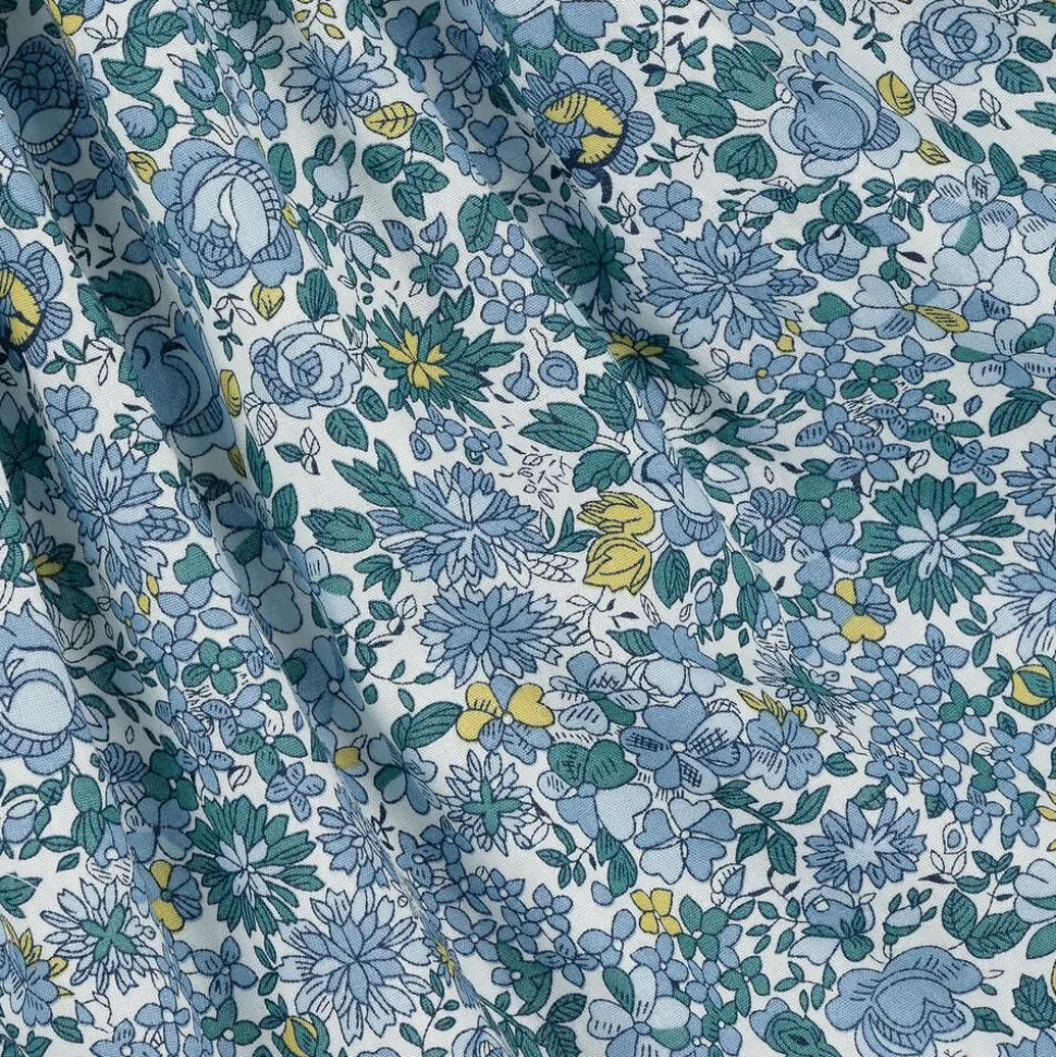 Pretty blue floral dress for girls by Rachel Riley, made in comfortable cotton fabric with a lightweight voile lining. Ideal for achieving that heritage look, a traditional smocked panel can be seen on the bodice, with delicate scalloped detailing and floral hand embroidery. It has a sweet rounded collar, long, puffed sleeves and a full, gathered skirt. There are iridescent button fastenings on the front for a classic finishing touch.