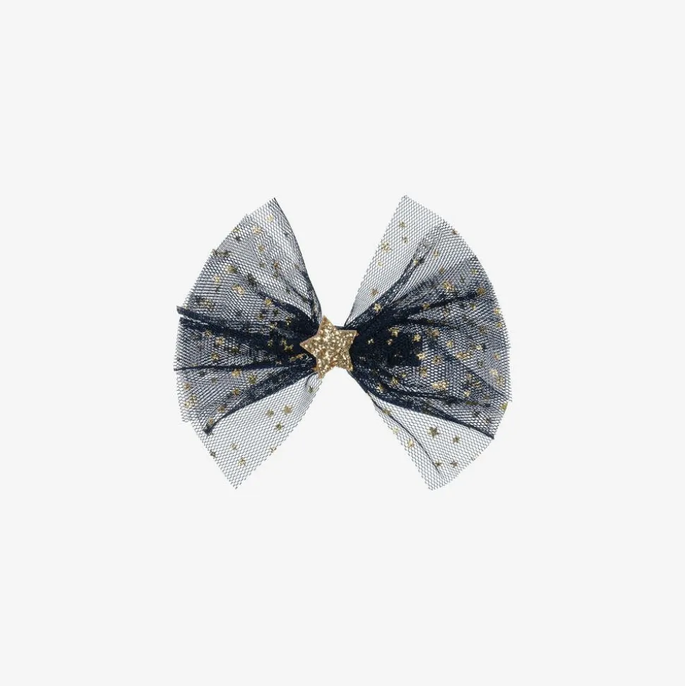 Great for parties, this navy blue hair clip is from Bowtique London. The handmade tulle bow is decorated in glittery gold stars with a charm in the centre. It is set on a fabric-covered clip for comfort.