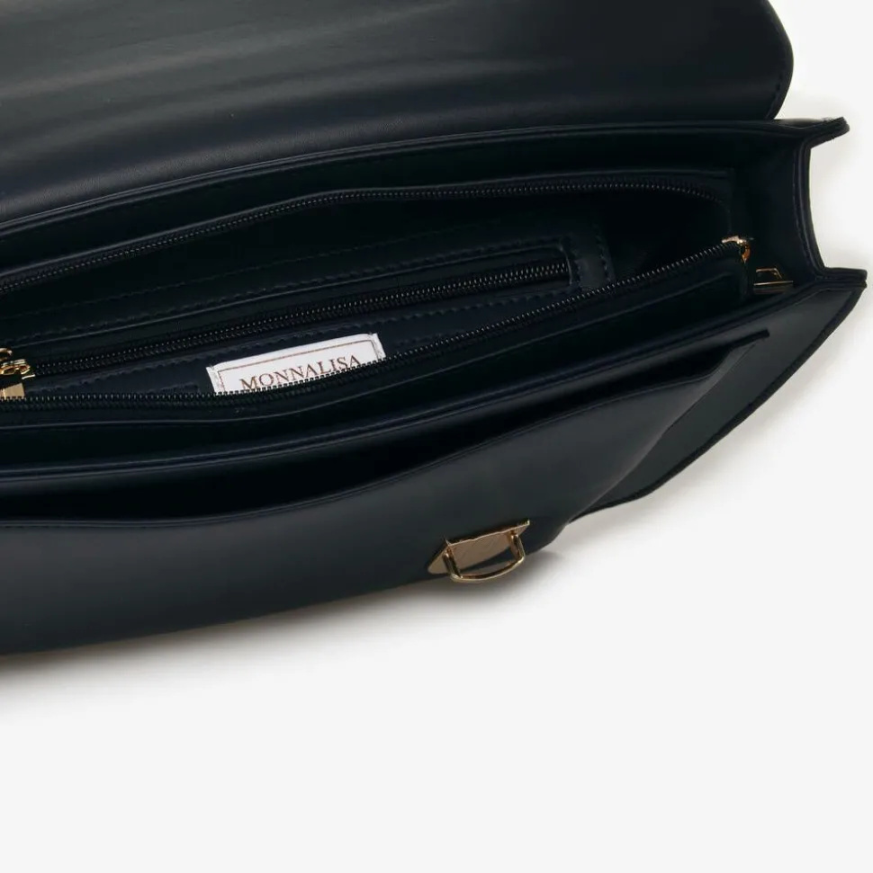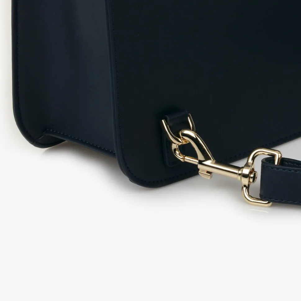 A smart navy blue leather blend satchel for girls by Italian brand Monnalisa, with shiny gold metal hardware. Sturdy and structured, this briefcase style bag has a zipped main compartment with internal zip pocket and a large slip pocket for easy organisation. The front flap fastens with two press clasps and has a pretty bow with a gold embossed logo above. Ideal for use as a school bag, it comes with two detachable and adjustable straps so it can be worn as a backpack.