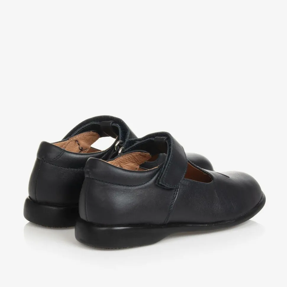 Exclusive to Childrensalon, a pair of traditional navy blue T-bar shoes for girls by Children's Classics made in soft leather, with a shaped leather inner sole for superior comfort. They fasten with velcro and have a non-slip rubber sole.