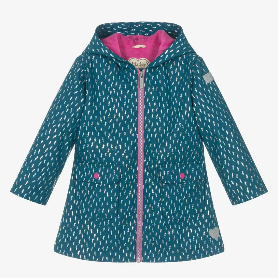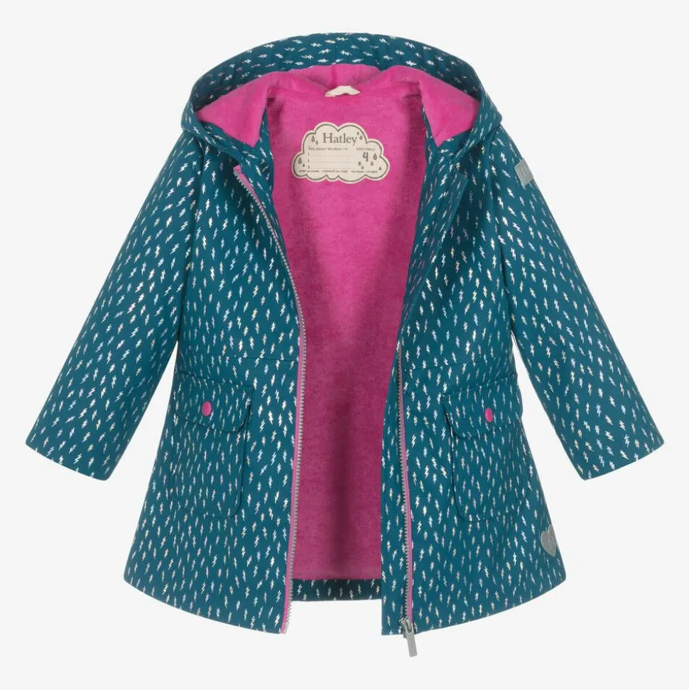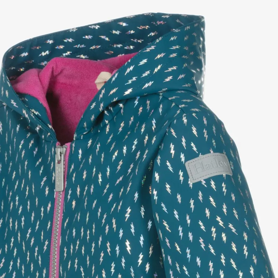 A lovely midnight blue hooded raincoat for girls by Hatley, patterned with mini lightning bolts in fun iridescent silver. Practical for rainy days, it has a smooth waterproof coating and light reflective patches with a soft, pink terry towelling lining for added comfort. It fastens with a silver zip on the front and has contrasting pink poppers securing the flap pockets.
