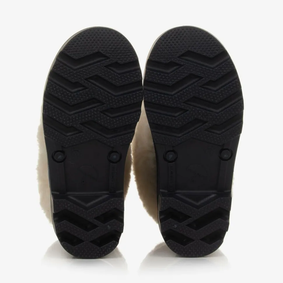 Practical yet stylish, these navy blue rain boots for girls are by luxury French brand ChloƩ. The rubberised uppers have gorgeous ivory faux fur trims, with a rubberised logo badge on one side. They have a soft textile lining for comfort, with treaded rubberised soles for good grip.