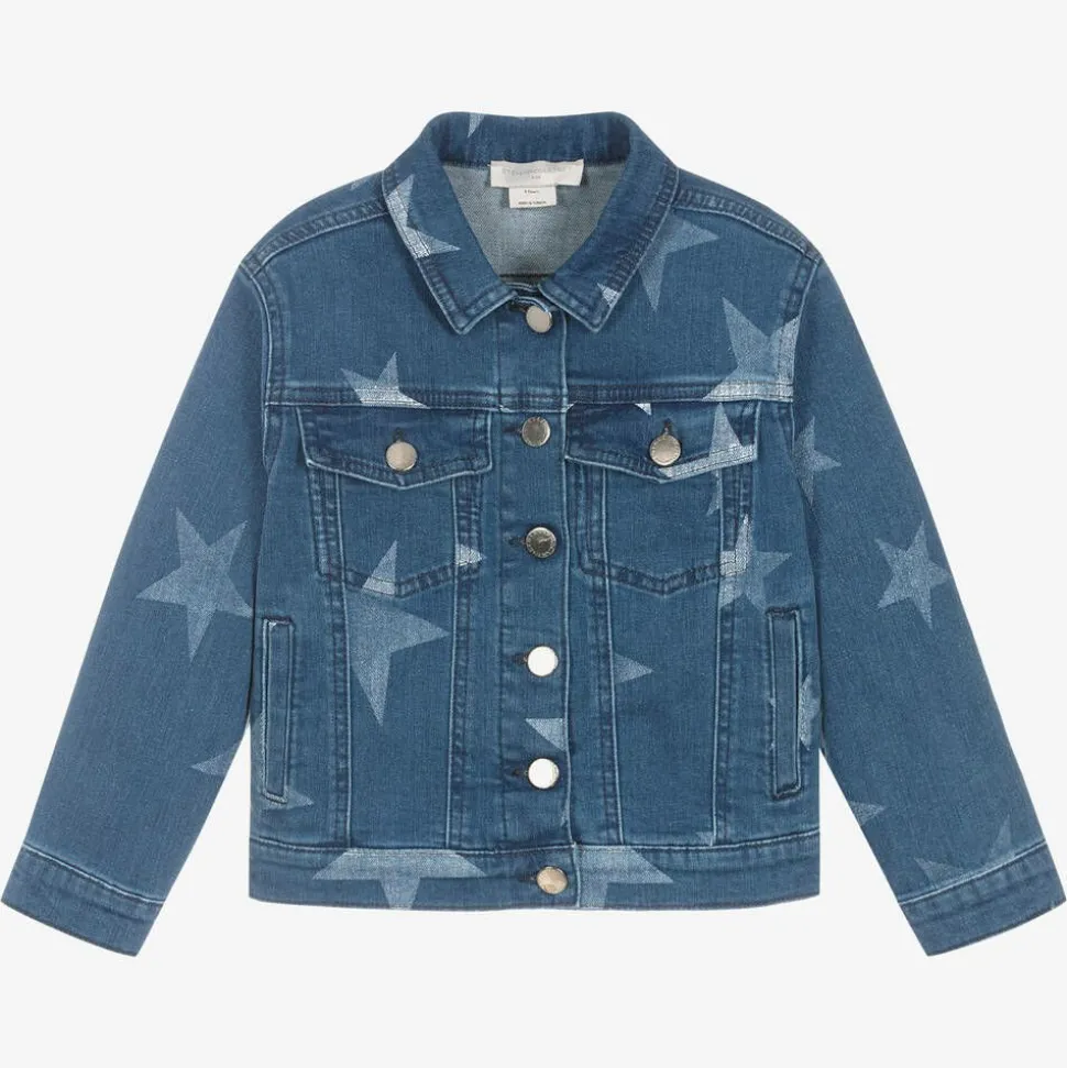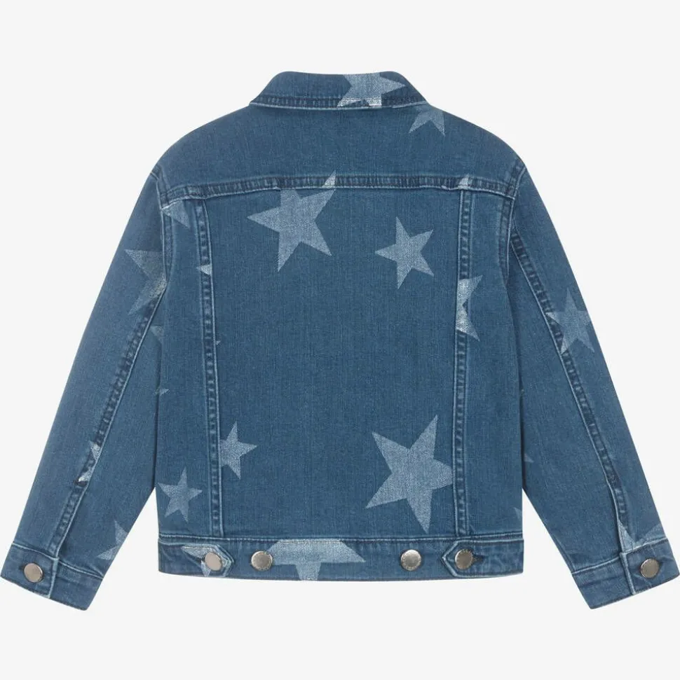Girls blue denim jacket from British label Stella McCartney Kids, inspired by the adult collection. This eco-conscious piece is made in soft, stretchy and comfortable organic cotton, and stamped with faded white star prints. There are pewter-coloured front button fastenings with logo engraving for cool designer detail. Combining style and utility, it has front pockets and an adjustable hem for a great fit. The Stella McCartney fit can be quite small so choose a size up if you want room to grow.
