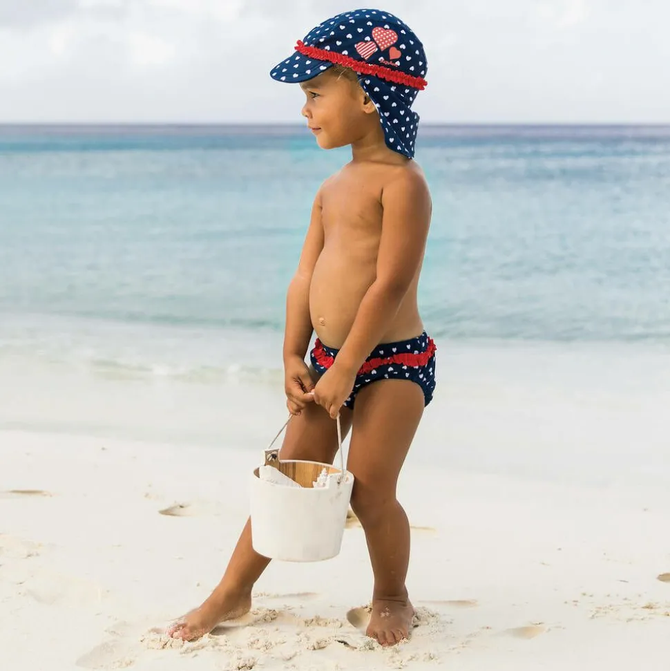 Girls navy blue Legionnaire-style swim hat by Playshoes, with UPF 50+ protection against the sun's harmful rays. Made in stretchy lycra with a white and red heart-print pattern and a pretty red trim, it is ideal for wearing in the pool. This sweet hat covers the ears and the back of the neck and has a peaked front to protect the eyes.