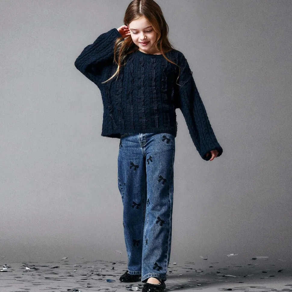 Mid-blue wash wide-leg jeans for girls by Name It, made from denim with organic cotton. They are embroidered with pretty black bow motifs, adding a touch of sweetness to this casual style. Complete with the classic five-pocket styling, they fasten with a zip and clasp on the front and have an adjustable waist for a comfortable fit.
