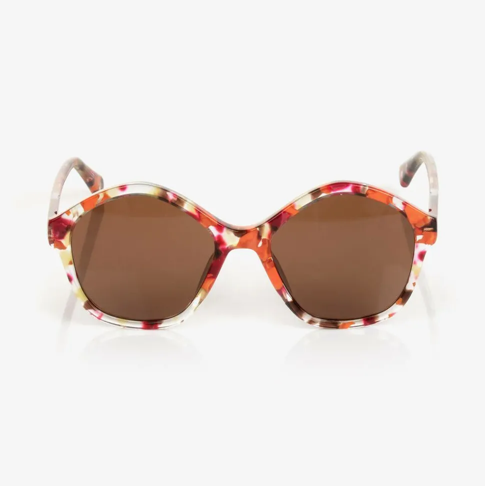 Chic geometric sunglasses for girls by luxury designer ChloƩ, with a brown, pink, and orange tortoiseshell-inspired design. The brown tinted lenses have a category filter of 3, providing high protection against sun glare. Subtly branded with a gold logo on one arm, these stylish sunglasses come with a pink branded zip-up pouch and care cloth.