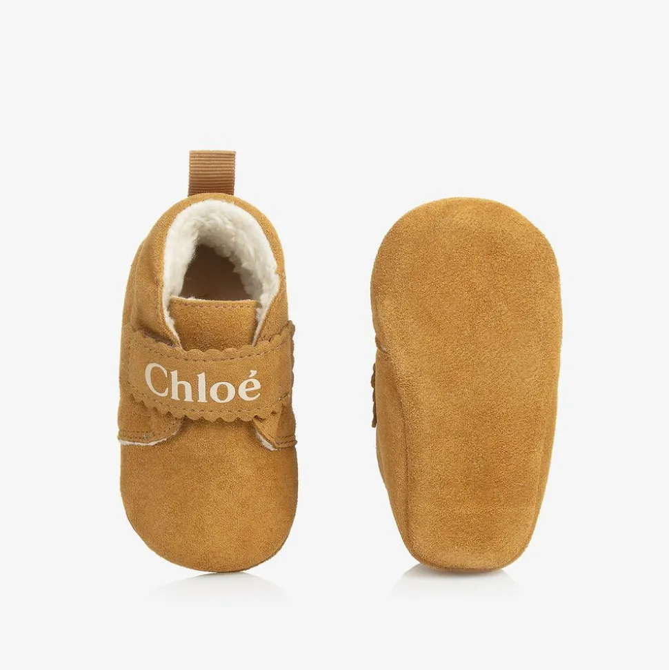 Adorable and stylish for baby girls, these tan brown pre-walker shoes are made in soft suede leather. For a distinctive designer touch, they have printed logos on the velcro-fastening straps and heel tabs, with embossed logos on the soles. They are comfortably lined in super soft, faux shearling and have ChloƩ's classic scalloped detail to complete the look.