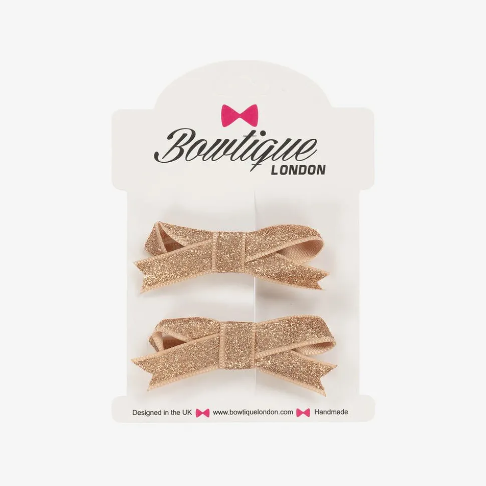 Two lovely hair clips for girls by Bowtique London, decorated with glittery gold ribbon bows. Set on a metal clip, they are easy to slide to keep hair in place.