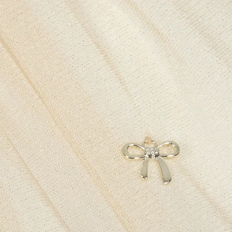 Exclusive to Childrensalon is this gold and ivory skirt set for baby girls by Sofija, made in soft cotton jersey. The ivory bodysuit has an all-over pale pink rose print, with frills on the sleeves. There is an envelope neckline and poppers between the legs to aide with dressing. The sparkly gold tulle skirt has a fixed bow on the waistband and a gold charm just above the hem.
