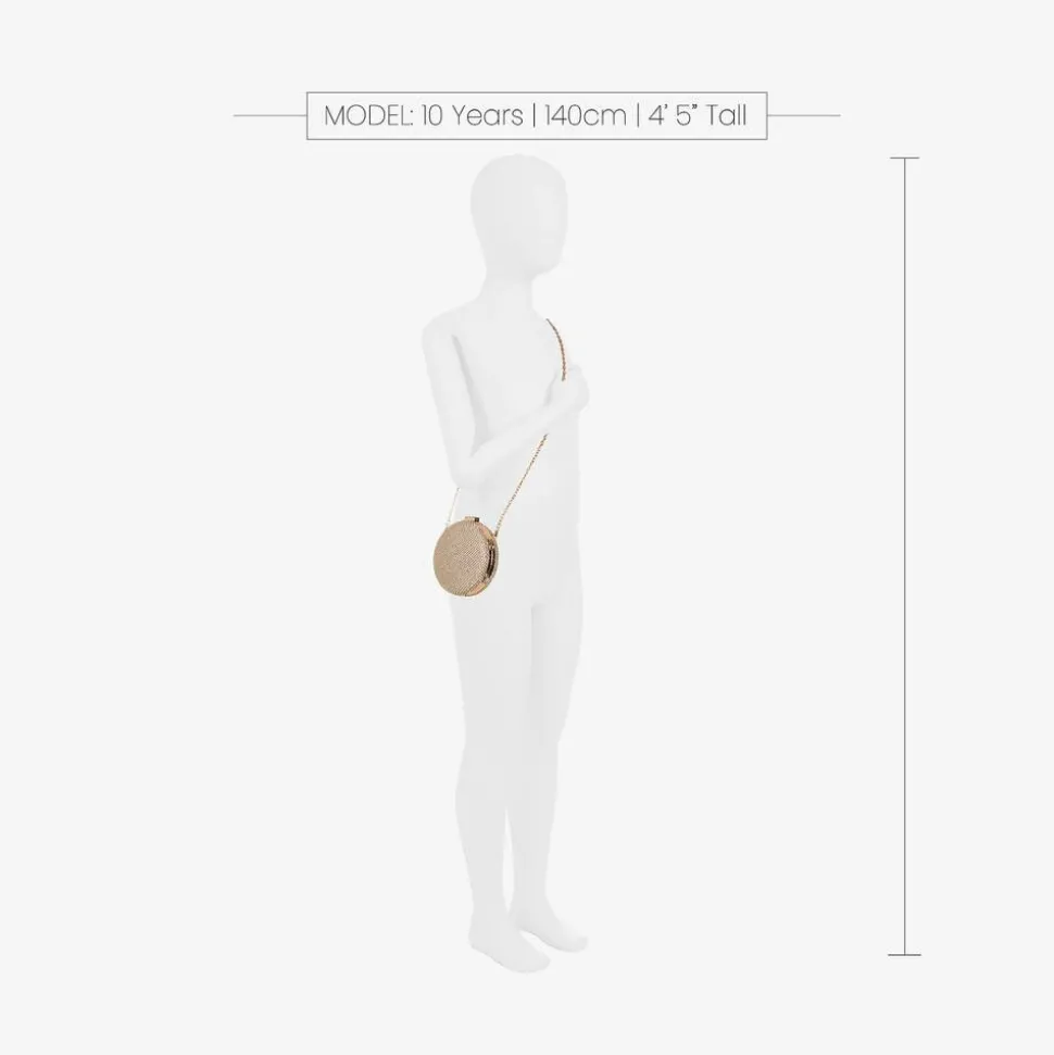 Sparkling gold round bag for girls by David Charles, encrusted with dazzling diamantés. This special occasion bag has a small, satin-lined compartment and a golden metal snap clasp fastening. A detachable, fine gold metal chain crossbody strap adds a versatile carry option to this glamorous clutch bag.
