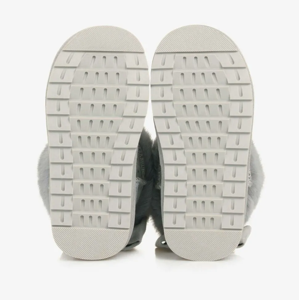 Gorgeous grey ankle boots for girls by Monnalisa. Made in faux suede with a faux fur lining and trim, they are patterned with sparkling diamantés. Completing the glamorous look, the heel is trimmed in glittery silver with a bow and heart logo charm detail. The flexible rubber outer sole is textured for good grip.