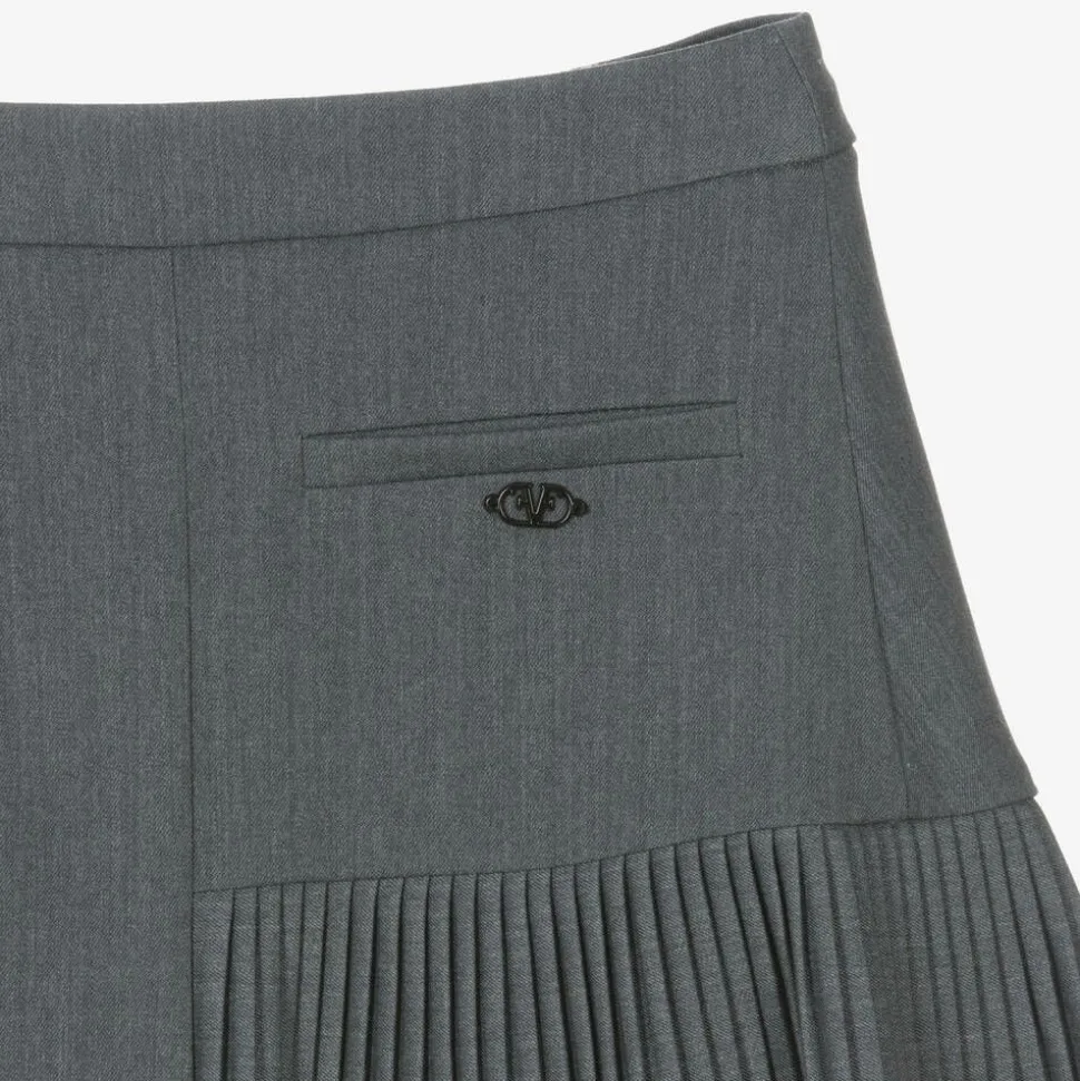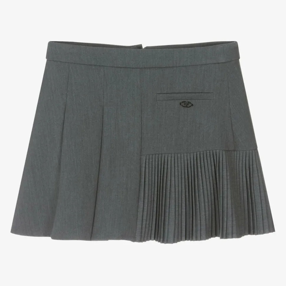 Smart pleated grey marl skirt for girls by Italian brand Fun & Fun, with contrasting, narrow pleated detailing on one side. It has a faux pocket on the front with a black logo charm and a zip fastening around the back. The skirt is fully lined in lightweight cotton voile for comfort.