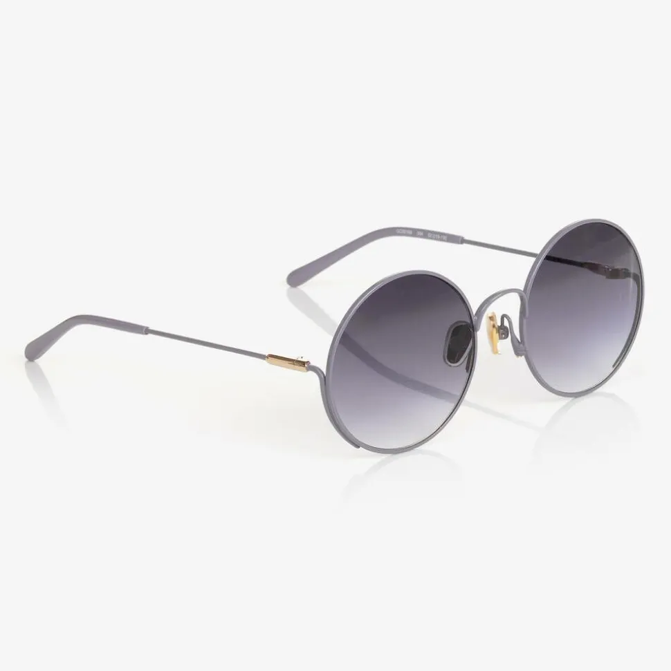 Super stylish round sunglasses for girls by luxury French label ChloƩ, with a slim violet grey frame. The grey gradient lenses have a category 3 filter, providing high protection against sun glare. They have subtle gold detailing on both arms, with a logo embossed on the left arm and on the nose pads. They come with a protective zip-fastening branded pouch and matching care cloth.