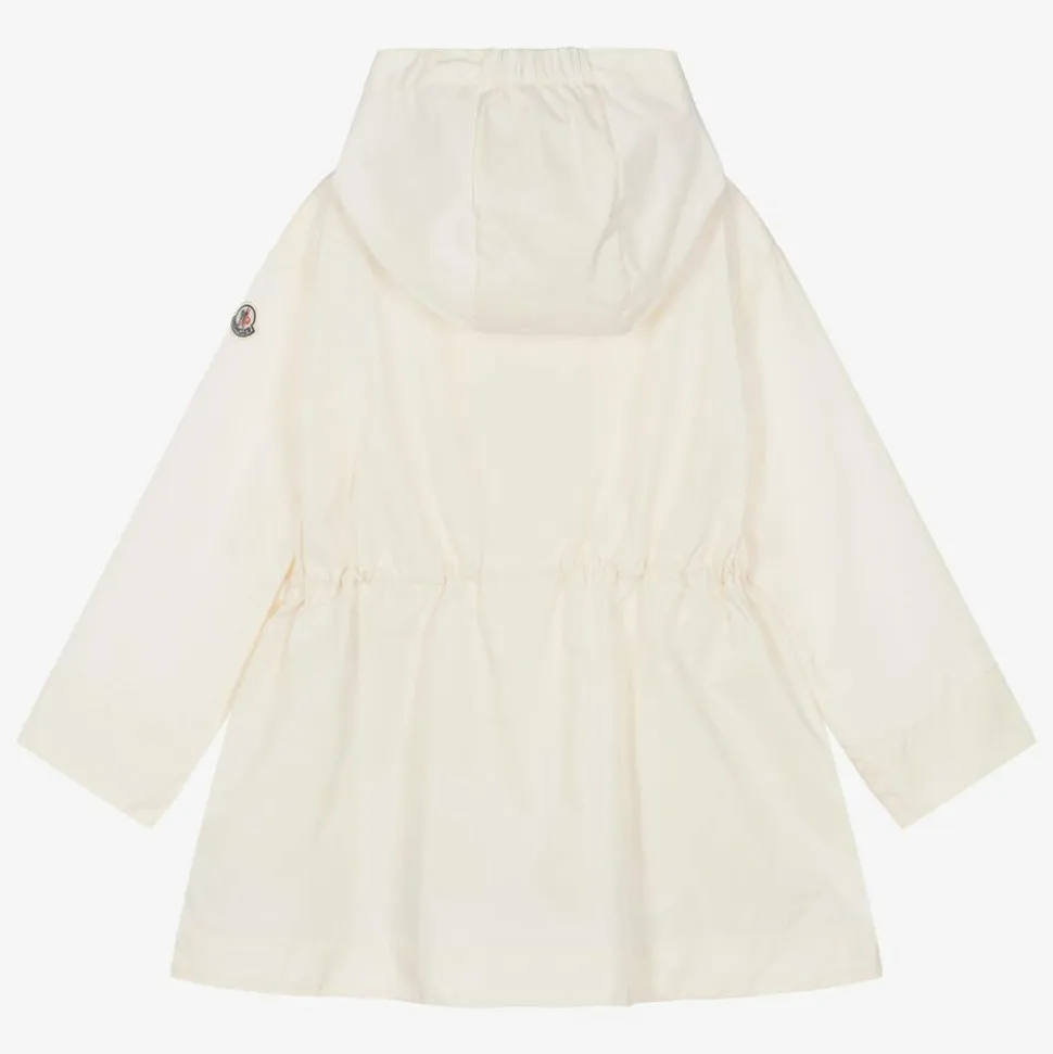 A lovely ivory hooded coat for older girls by luxury brand Moncler Enfant, with a concealed front zip fastening. Smooth and lightweight, it has large patch pockets on the chest and an internal drawstring to cinch in the waist. There are useful zipped pockets on the front, with the brand's instantly recognisable felt logo patch on one sleeve, adding a signature finish.
