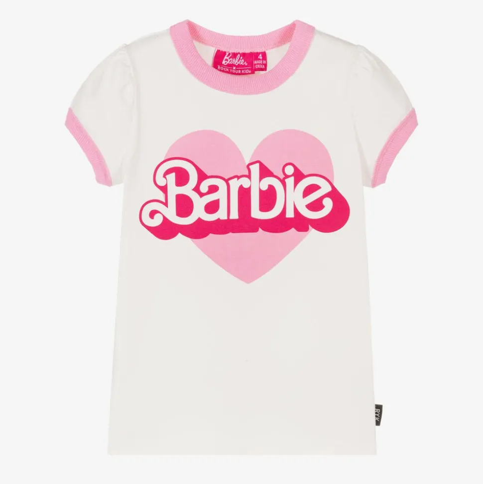 Girls ivory T-shirt by Rock Your Baby, made in soft cotton jersey. It has a bold Barbie heart motif printed on the chest and playful pink piping. The sleeves are puffed for a super cute look.