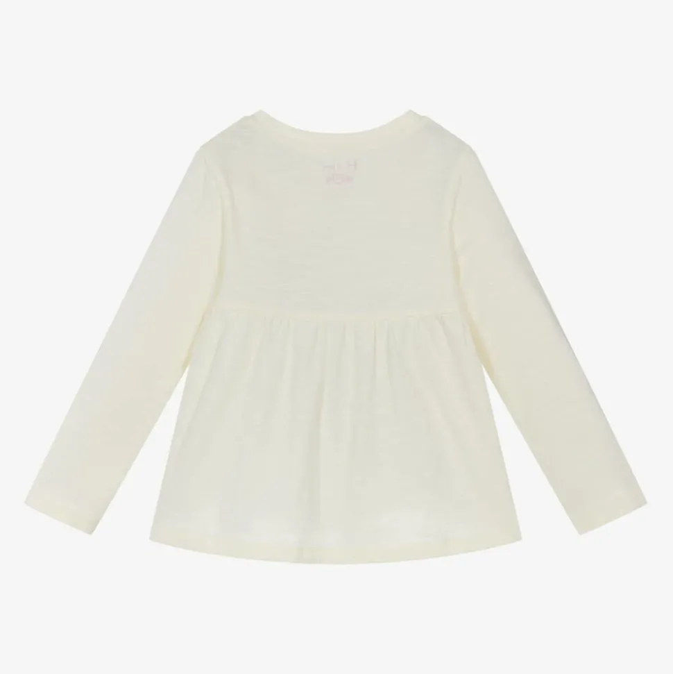 Cute and festive, an ivory long-sleeved top for little girls by Canadian brand Hatley, made in soft, slub jersey. It has a skating baby deer printed on the front with embroidered detailing and pretty gathering across the back.