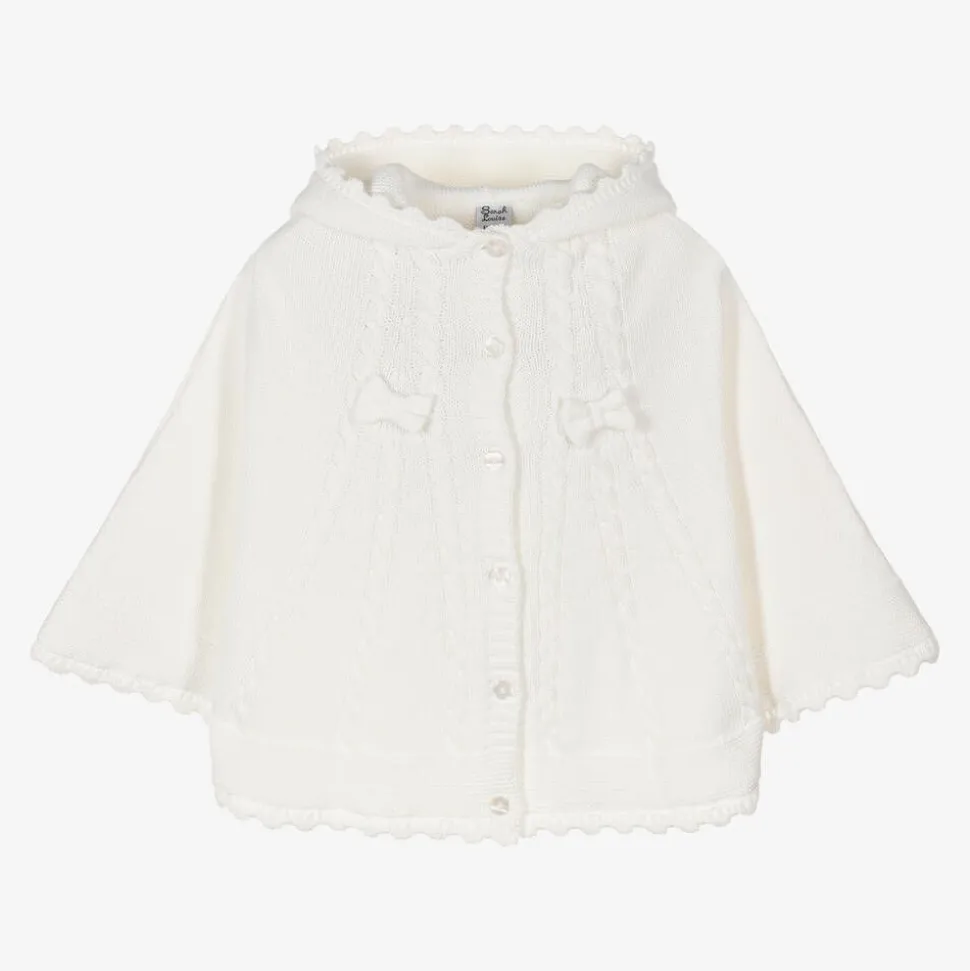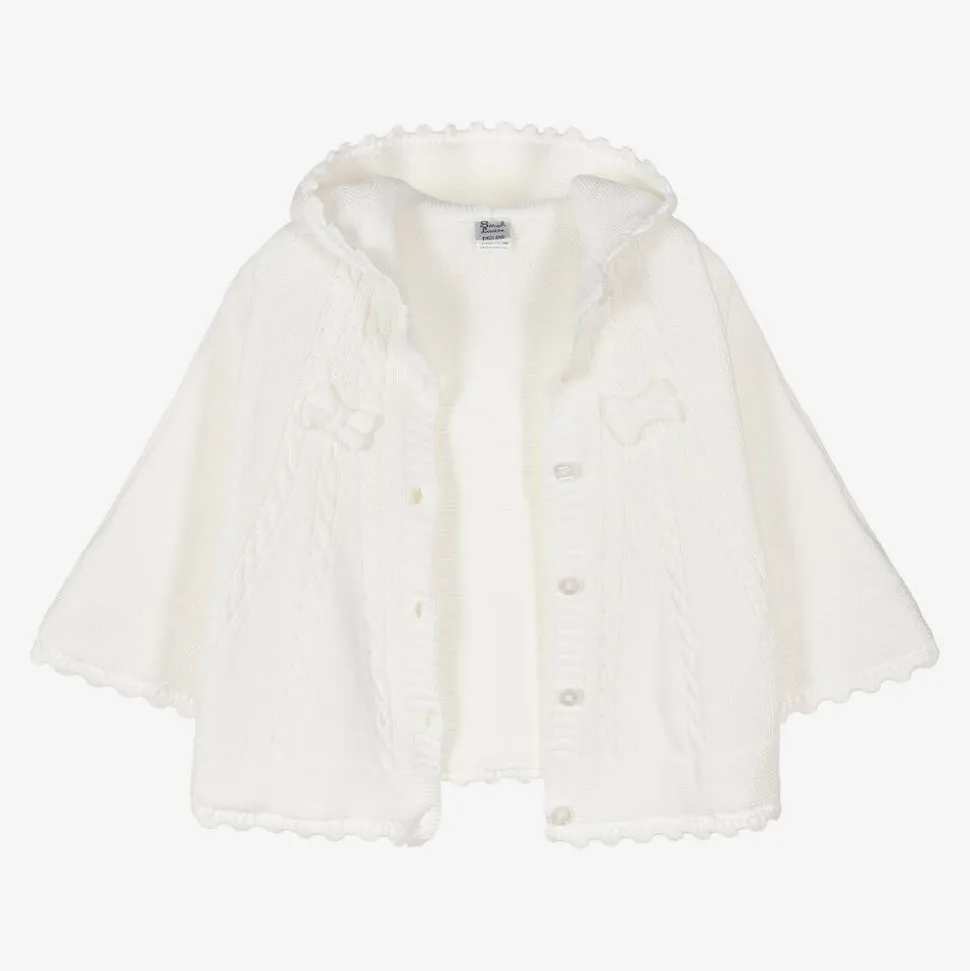 Cosy and warm for little girls, a delightful ivory cape by Sarah Louise. Made in a double-layered soft cotton knit, it has classic cable stitch detailing and pretty decorative bows. There is a cosy hood, button fastenings down the front, and poppers to create arm holes.