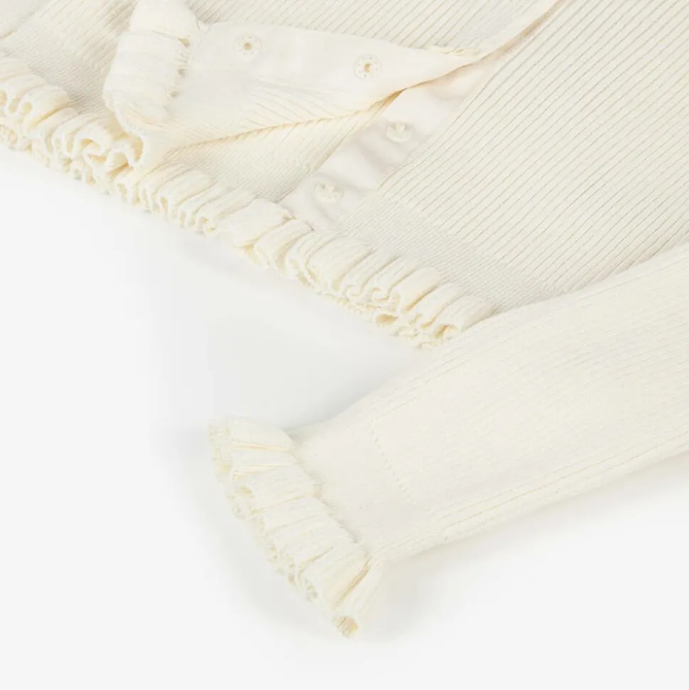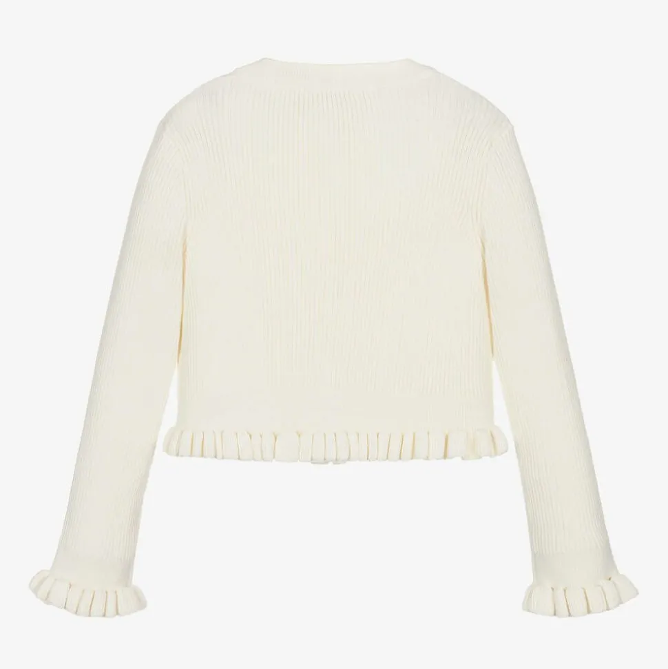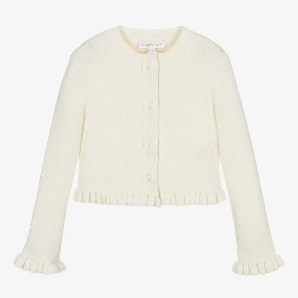 A lovely ivory cardigan for girls by Angel's Face. It is made in a softly ribbed cotton knit and has pretty ruffle trims. The concealed popper-fastening placket is decorated with sweet grosgrain bows down the front.