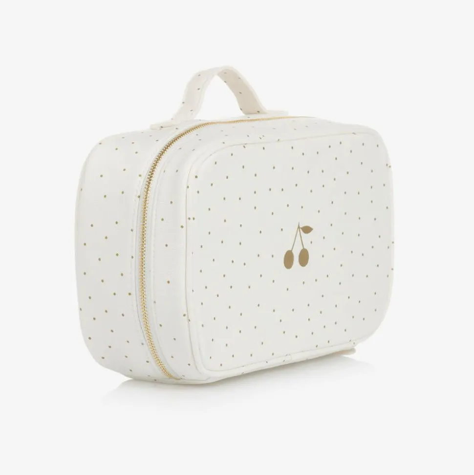Made from soft cotton canvas, this lovely ivory washbag for girls is by French luxury brand, Bonpoint. With one main roomy zip compartment, this cute bag has a gold polka dot pattern, a cherry print on the front, and a convenient carry handle on the top.
