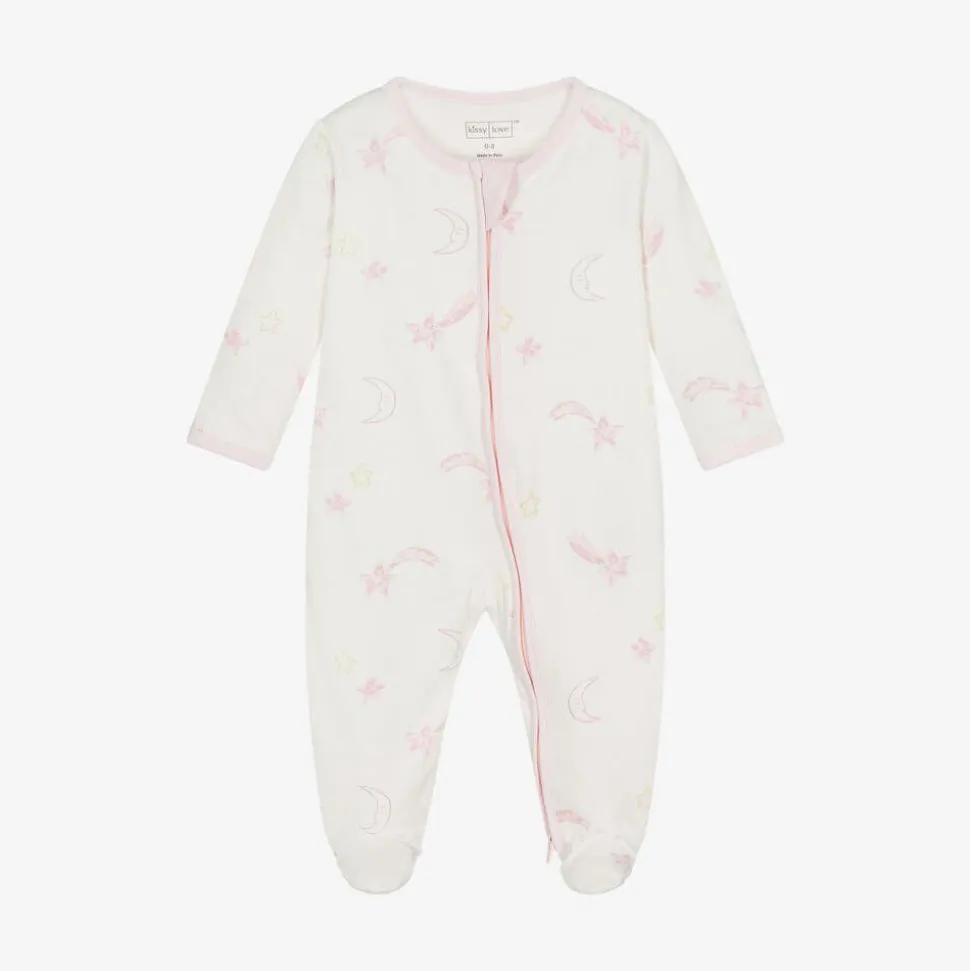 A delightful ivory babygrow for girls by Kissy Love, made from soft Pima cotton jersey. Printed with a pink stars and moons pattern, it has pale pink trims and a practical two-way zip on the front. There is a protective chin guard and fold-over scratch mitts on smaller sizes for added comfort.