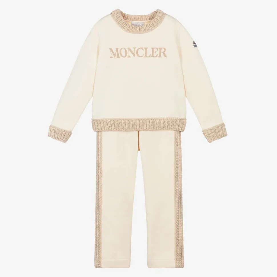 Stylish ivory tracksuit for girls by luxury brand Moncler Enfant, with chunky knitted beige trims. Made in soft cotton jersey with a cosy, fleecy inside, the sweatshirt has a large logo embroidered across the chest, for an instantly recognisable look. The joggers have a comfortable, elasticated waistband and a straight-leg style.