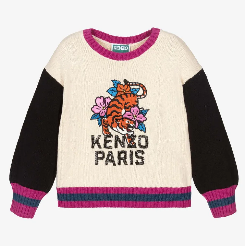 Ivory sweater for girls by KENZO KIDS, knitted in a soft cotton and wool blend. Embroidered with cartoon-style flowers, this distinctive piece has long black sleeves and magenta pink striped trims. An orange tiger on the front adds an emblematic statement, joined by a sequin Kenzo Paris logo below.