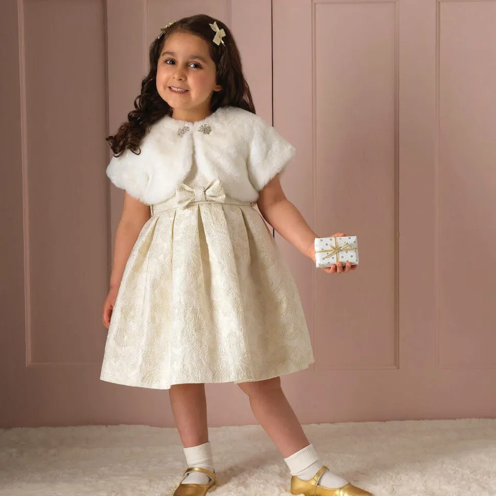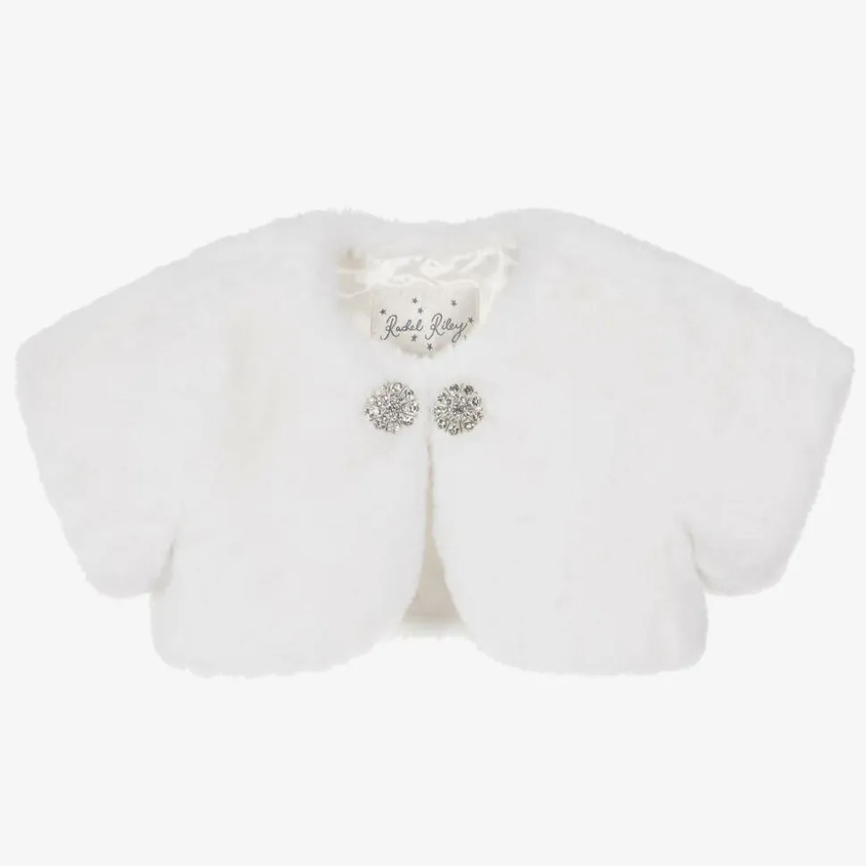 Beautiful ivory bolero jacket for girls by British brand Rachel Riley, made in super soft faux fur. It sits beautifully over the shoulders when layered with a glamorous special occasion look. Lined in satin, it has two sparkly diamanté button trims on the front and fastens with a concealed hook and eye.