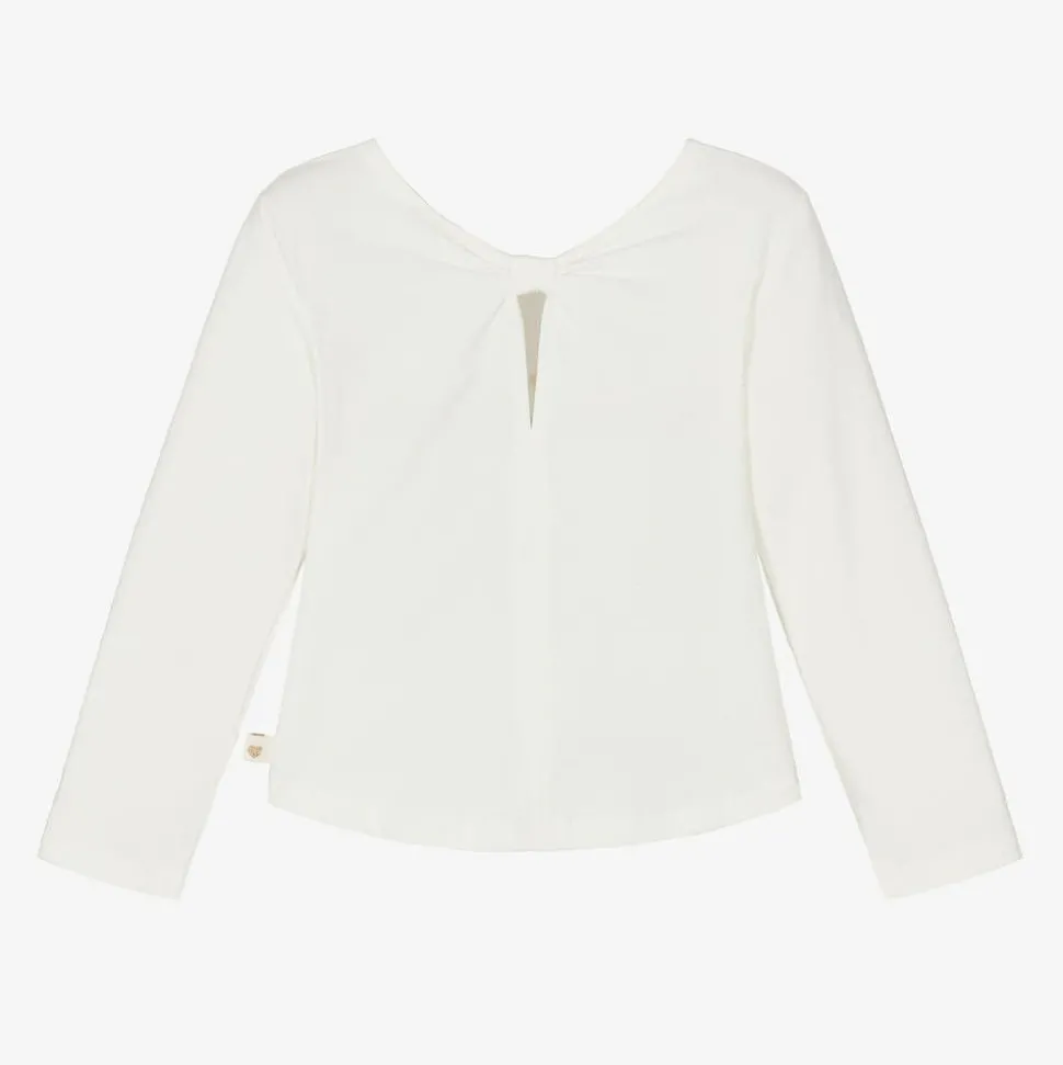 Ivory top for girls by Boboli, made in soft and stretchy cotton jersey. It has long sleeves, a round neckline and a knotted detail on the back. A fun graphic print on the front illustrates three girls dancing under a sequin disco ball in gorgeous party dresses.