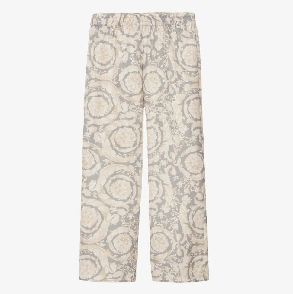 A pair of elegant, silk twill trousers for girls by luxury label Versace, patterned with the Italian designer's ornate Barocco print in soft hues of ivory and grey. Beautifully silky and lightweight, this timeless style has a stretchy elasticated waistband for a comfortable fit.