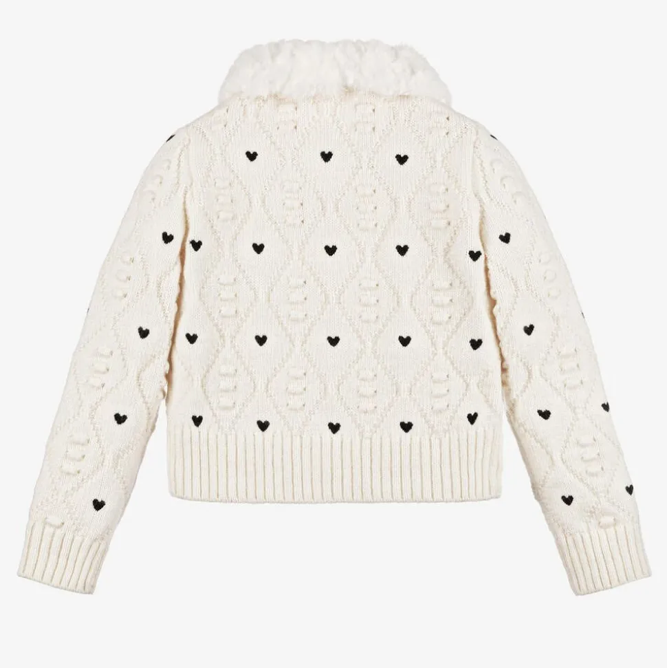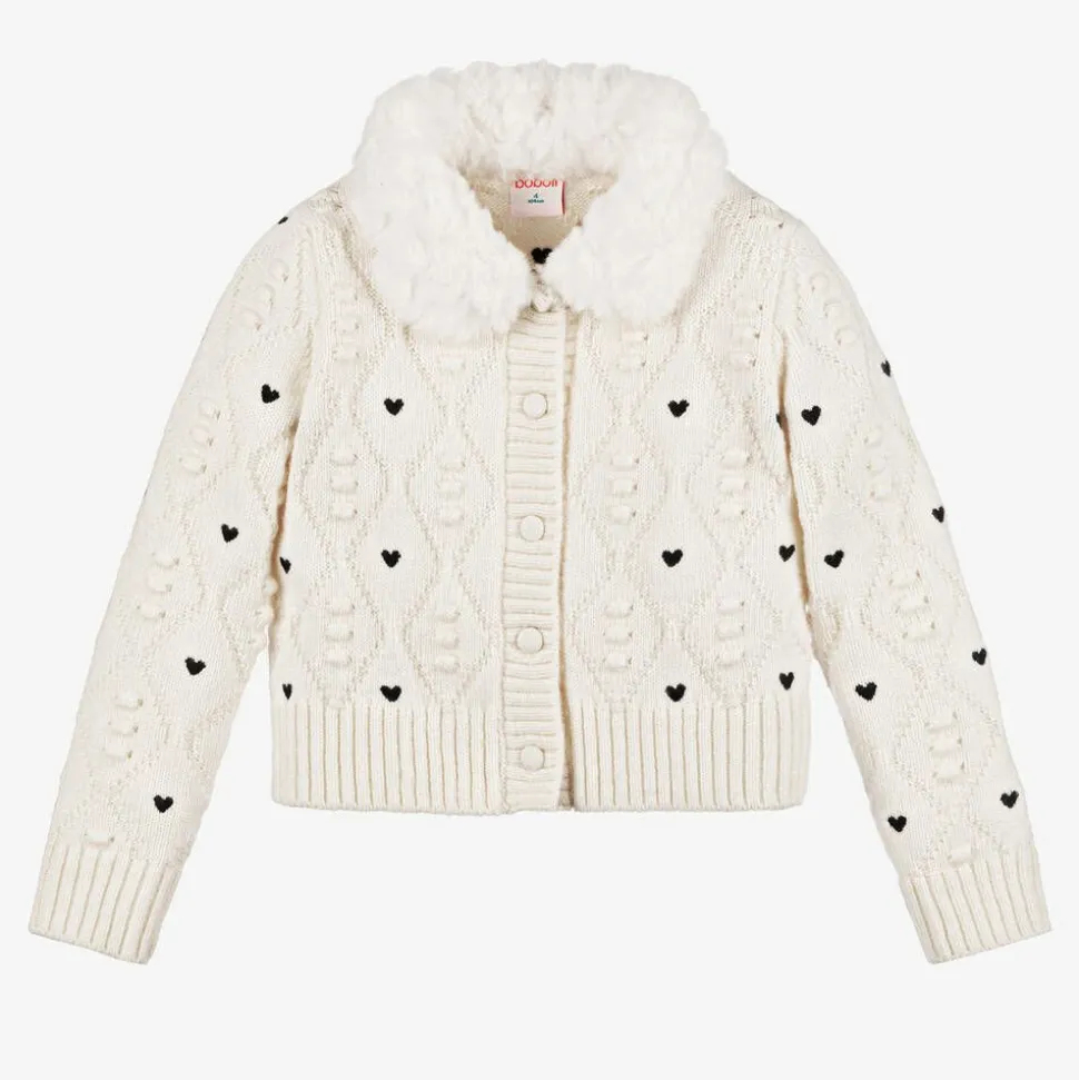 Beautifully soft and warm, this ivory, mid-weight knit cardigan for girls is by Spanish brand Boboli. It has a faux fur collar and a diamond knit pattern, with bobbles and little black hearts. Neat ribbed trims add extra cosiness and the cardigan fastens with buttons on the front.