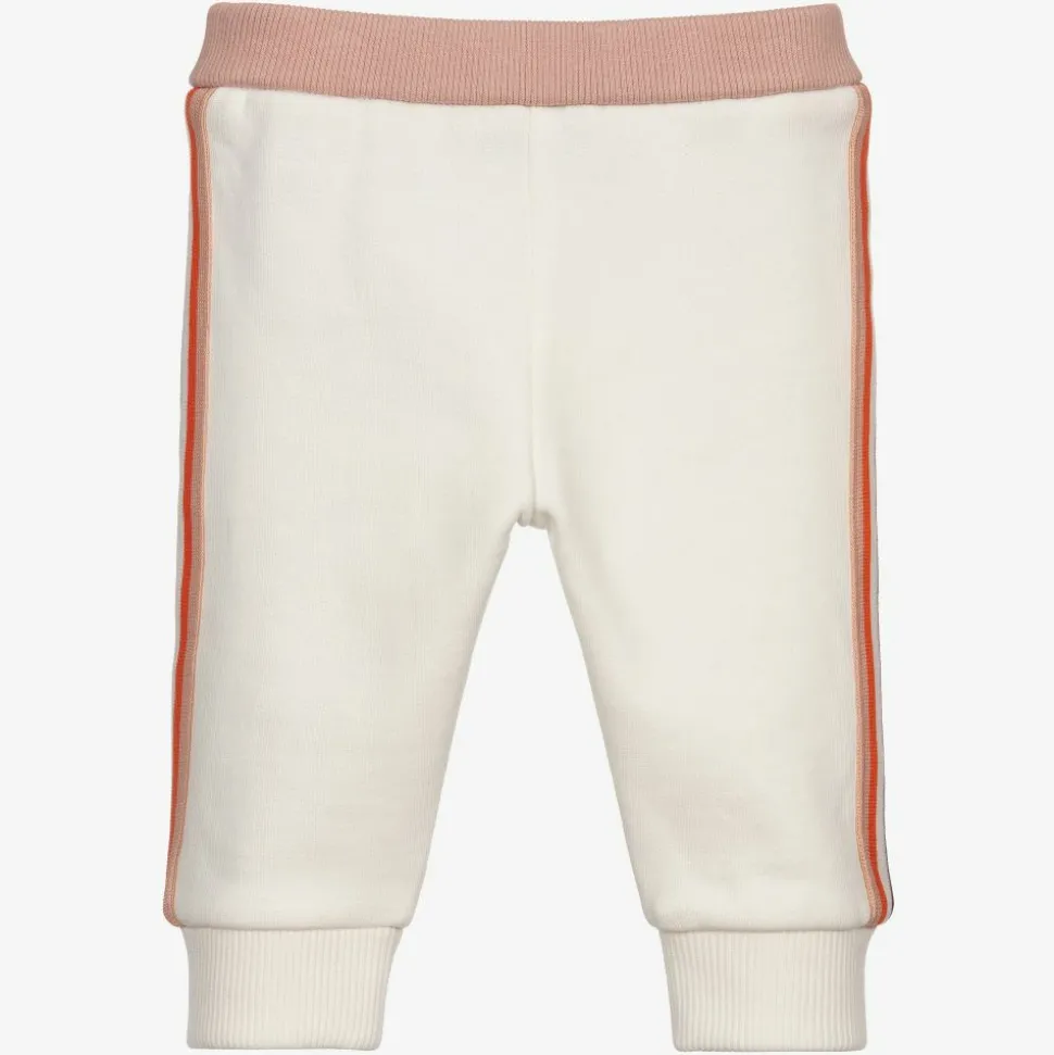 Ivory cotton joggers for baby girls by Moncler Enfant. Mid-weight and stretchy, they have a pink, elasticated waistband and pink, orange and white ribbed stripes down the legs. The designer's signature rubber logo badge is positioned at the ankle. The inside is a soft, brushed fleece.