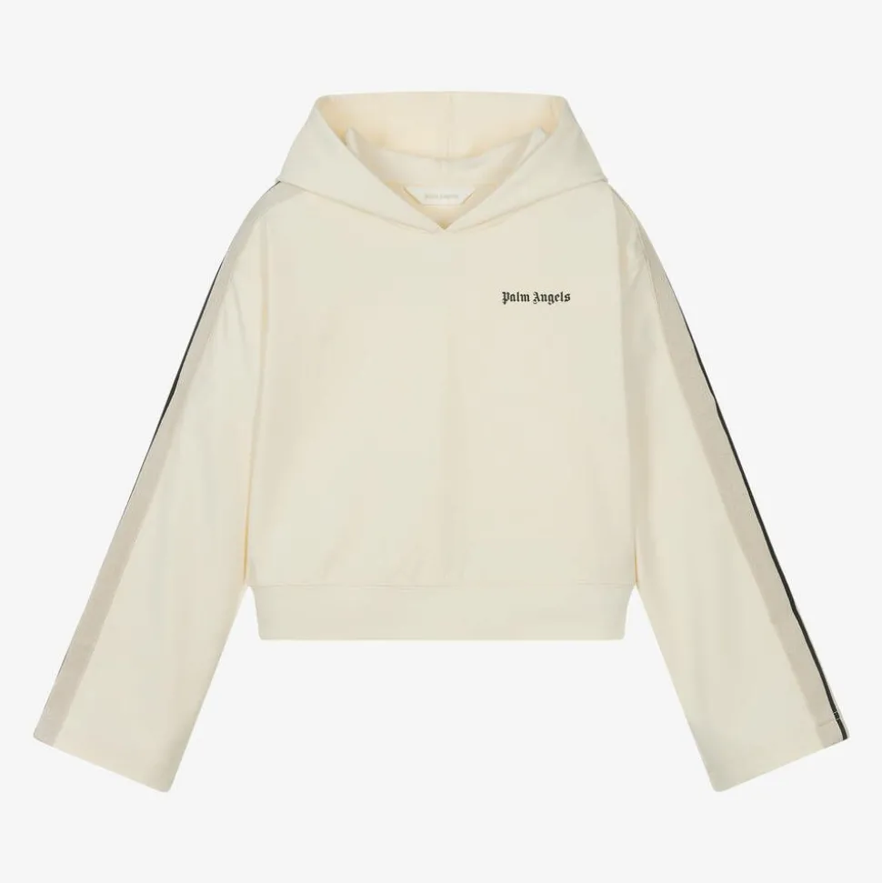Ivory hoodie for older girls by Palm Angels, made in soft Milano jersey for comfortable wear. It is designed in a stylish boxy fit, with wide beige and black taping along the sleeves adding a cool, sporty touch. The brand's logo is stamped on the chest in black, for a distinctive designer finish.