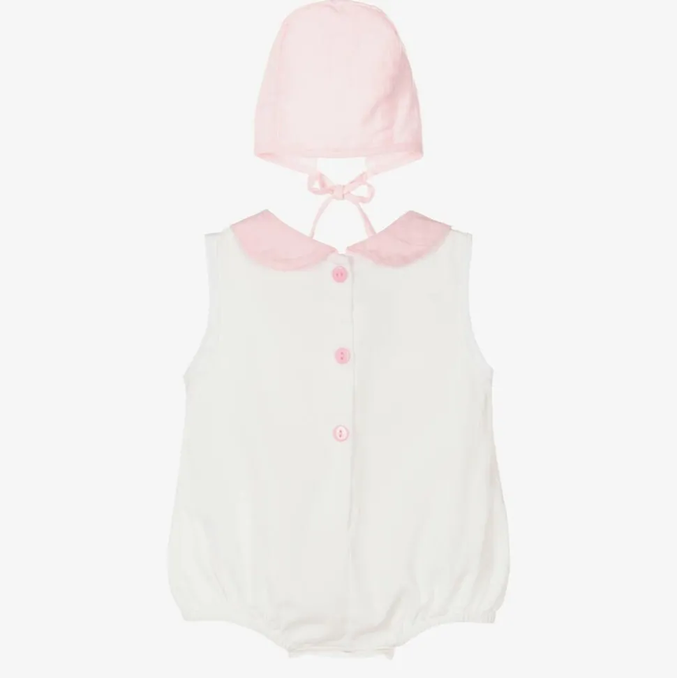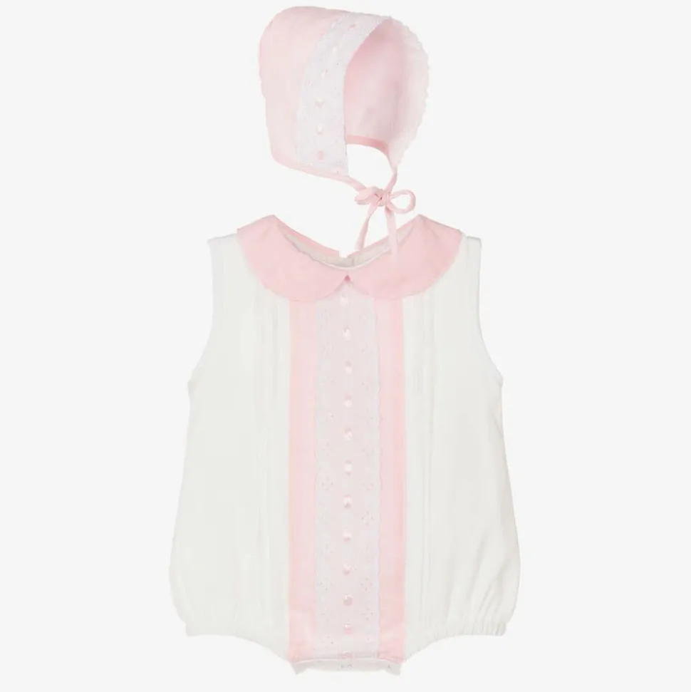 A delightful ivory and pink shortie and bonnet set for baby girls by Beau KiD, made from soft and lightweight cotton. Classically styled with a rounded collar, the pretty shortie has a broderie anglaise and satin ribbon trim on the front. It fastens on the back with pink buttons and has useful poppers between the legs. Completing the traditional look, the bonnet has matching trims and ties to secure under the chin.