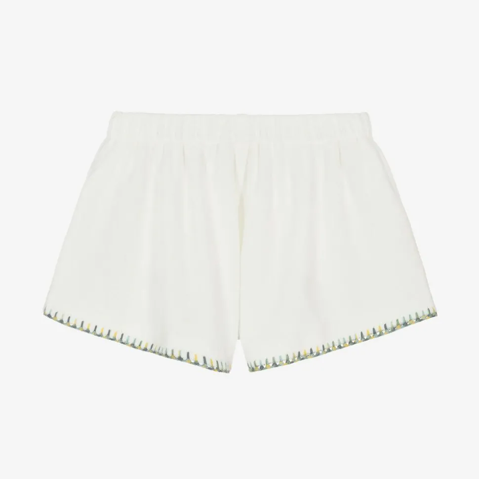 Ivory shorts for girls by luxury brand Zimmermann, made in soft cotton towelling. Ideal for beach and resort wear, they feature an embroidered green logo design and coordinating green and yellow trims. Comfortable to wear, the waistband is gently elasticated with a fixed bow on the front.